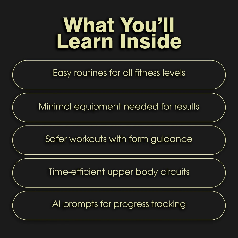 Unlike generic workout guides, this resource blends practical upper body strength training at home with smart AI-powered tools that help you personalize, track, and refine your progress. It’s not just a workout—it’s a system that grows with you.
