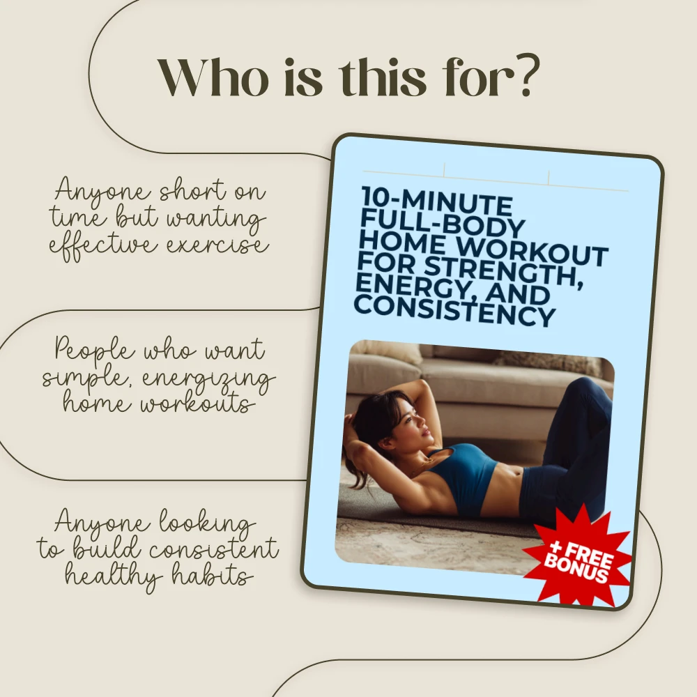 Don’t let lack of time hold you back. With the 10-Minute Full-Body Home Workout for Strength, Energy, and Consistency, you’ll have a simple yet powerful plan that makes fitness achievable and enjoyable. Download your copy today and start building strength, energy, and consistency—10 minutes at a time.