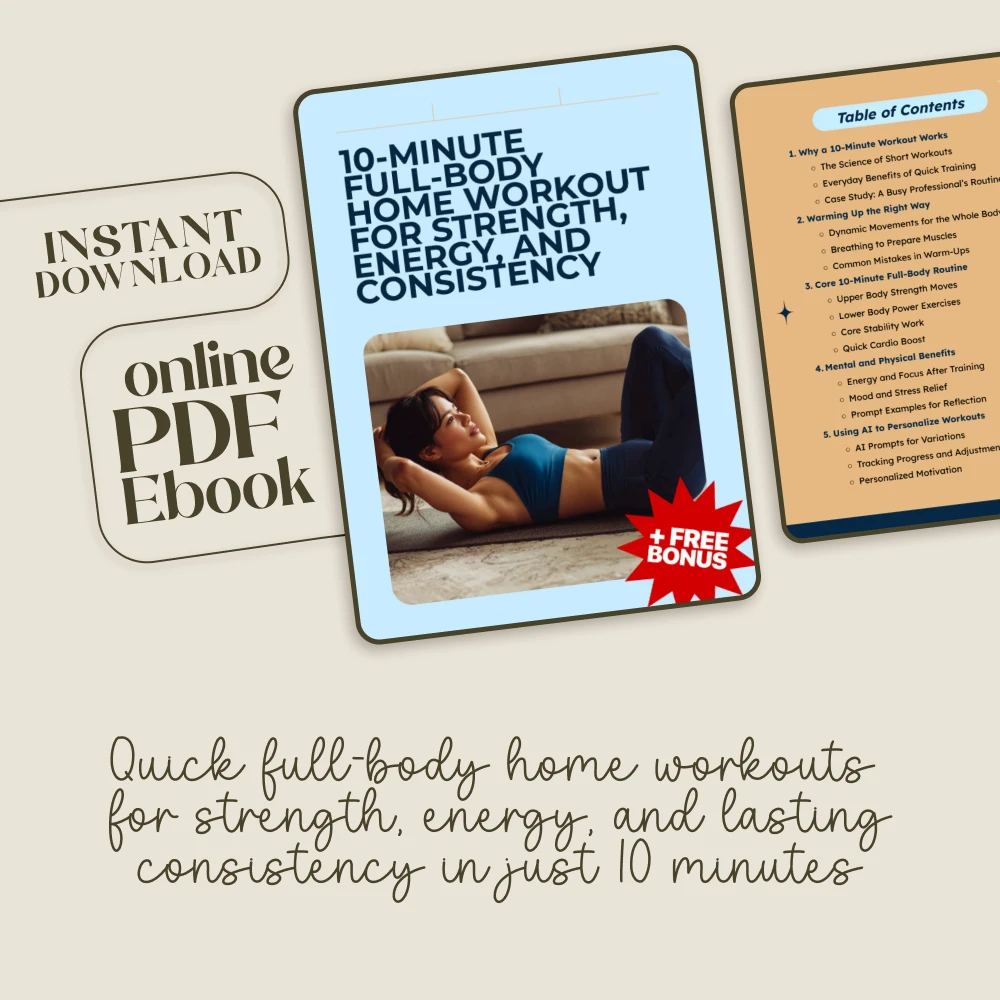 Life gets busy, but fitness doesn’t have to be complicated. The 10-Minute Full-Body Home Workout for Strength, Energy, and Consistency is a simple, effective digital ebook designed to help you transform your routine with fast, impactful workouts that fit any schedule. Whether you’re new to exercise or looking for a quick and reliable way to stay active, this guide is your go-to resource for sustainable results from the comfort of your own home.