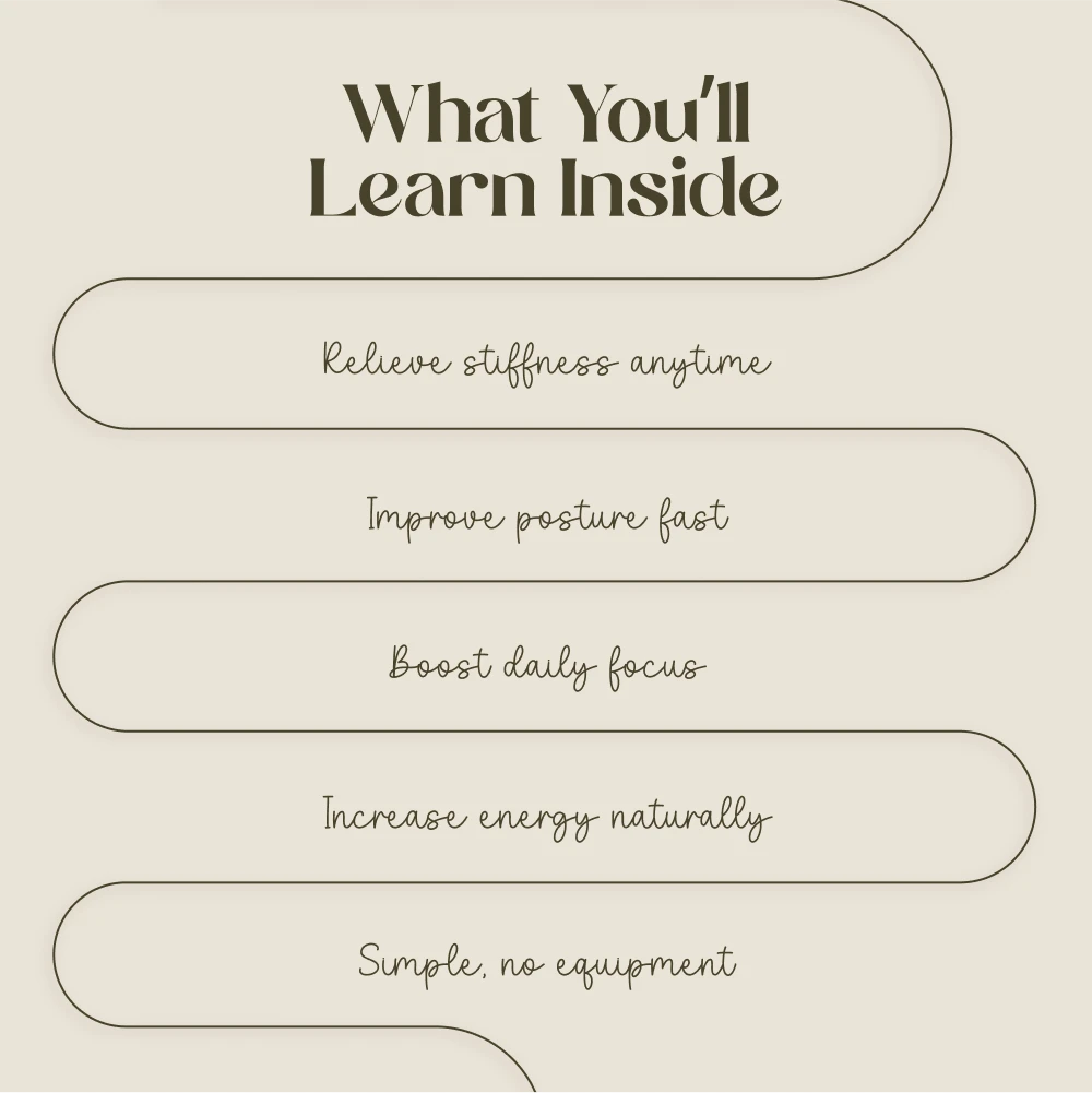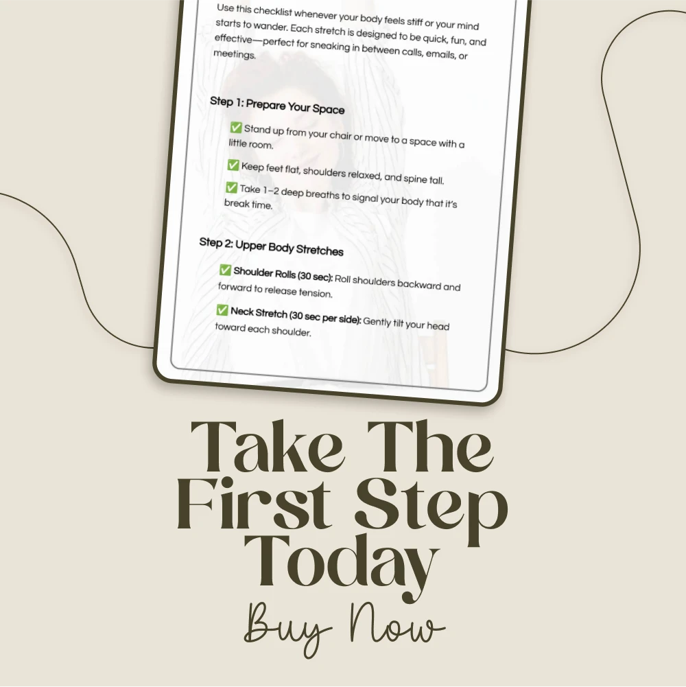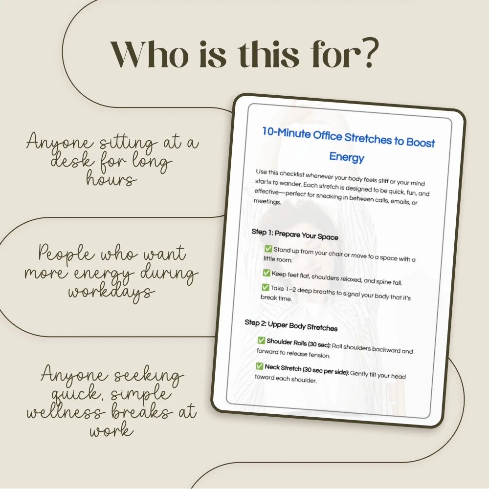 This digital checklist is ideal for anyone who spends long hours sitting at a desk—whether you’re a corporate professional, a remote worker, a student, or even a busy entrepreneur. If you want to reduce stiffness, prevent burnout, and feel more energized without disrupting your workflow, this resource was made for you.