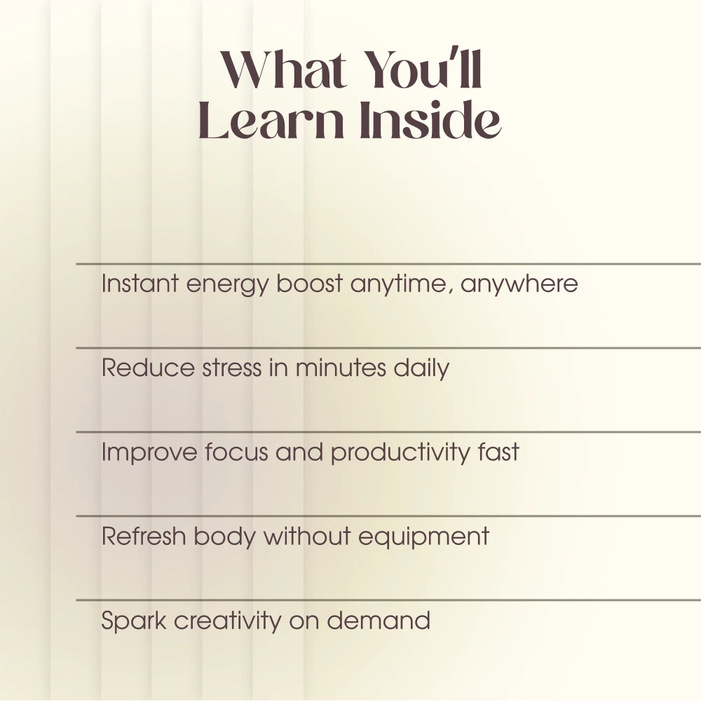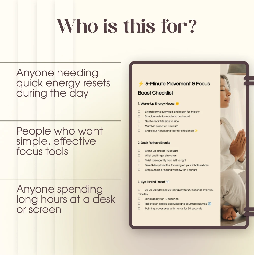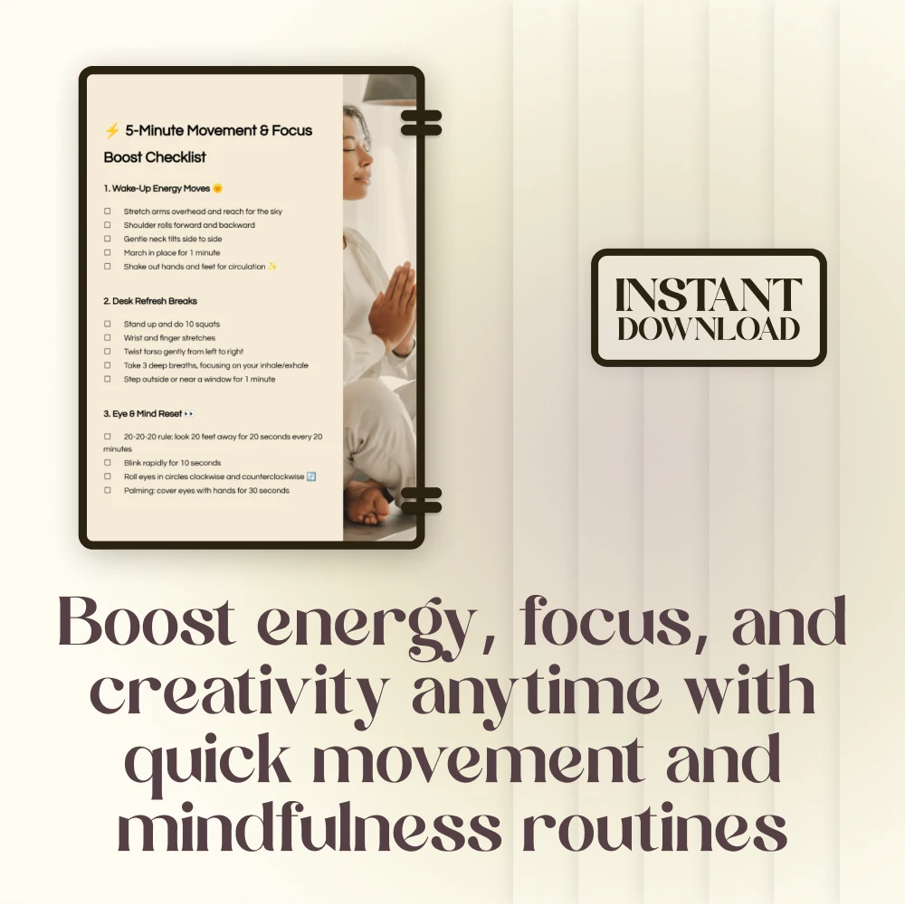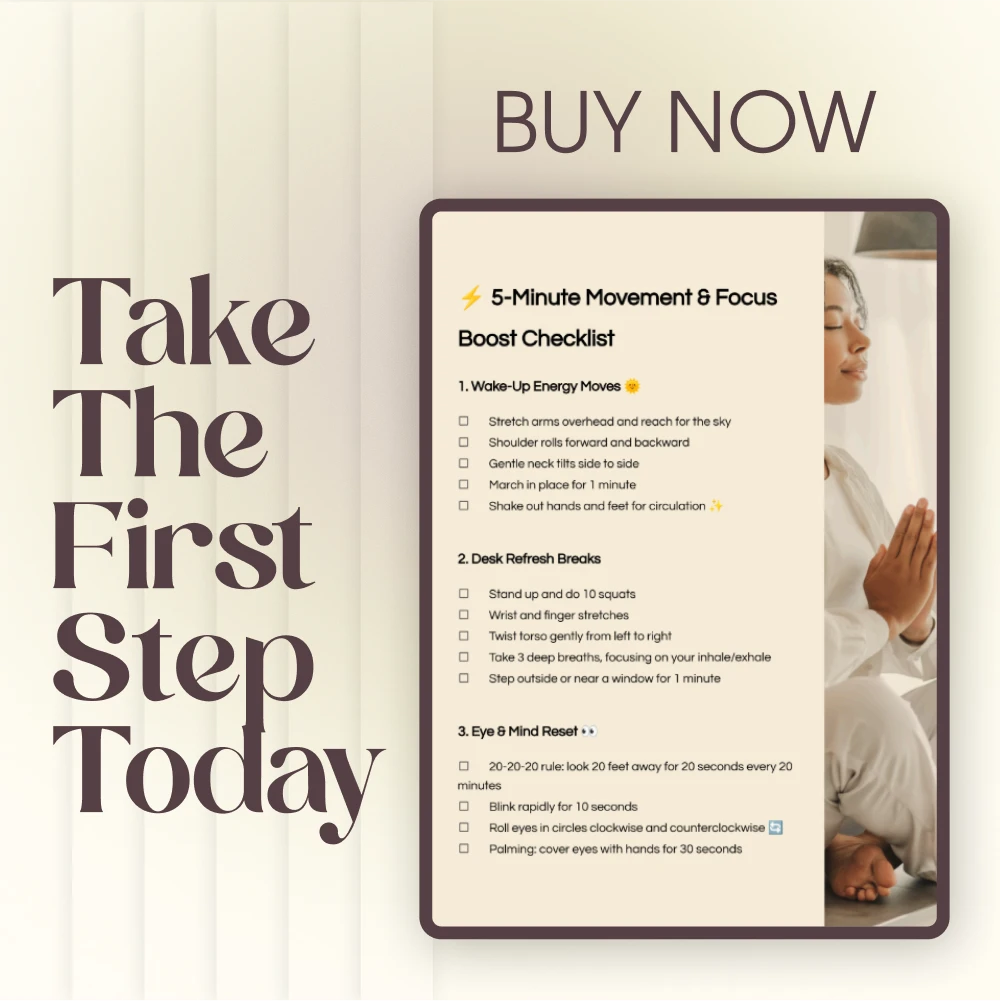Why wait to feel better when you can recharge in just minutes? Download the 5-Minute Movement & Focus Boost Checklist now and transform the way you work, study, and create. Give yourself the energy and clarity you deserve—one mindful break at a time.