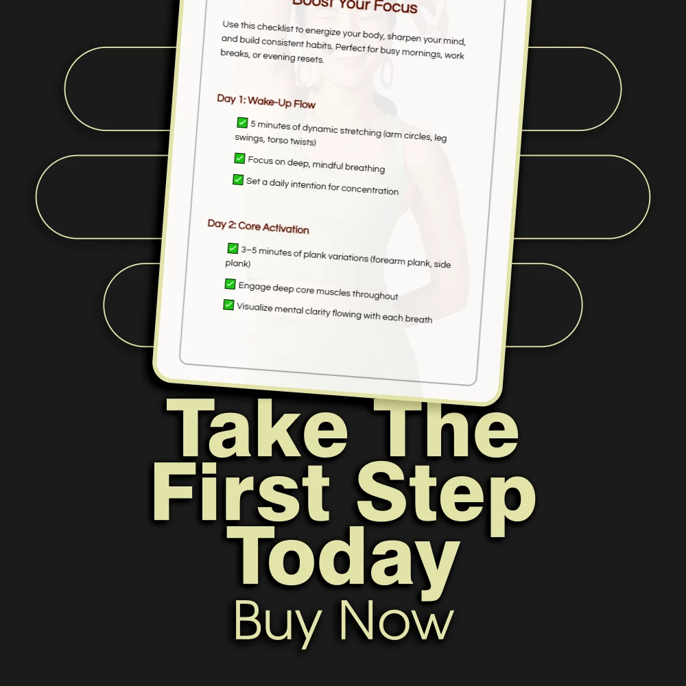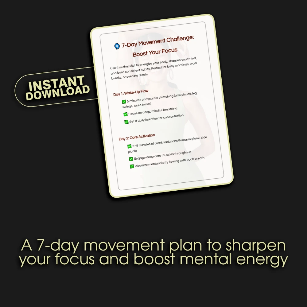 This digital checklist is perfect for busy professionals, students, remote workers, entrepreneurs, and anyone who struggles with distraction. If you want to improve your concentration without a major time commitment, this structured, gentle 7-day movement challenge to improve focus is your ideal starting point. It requires no special equipment and fits into even the most packed schedule.