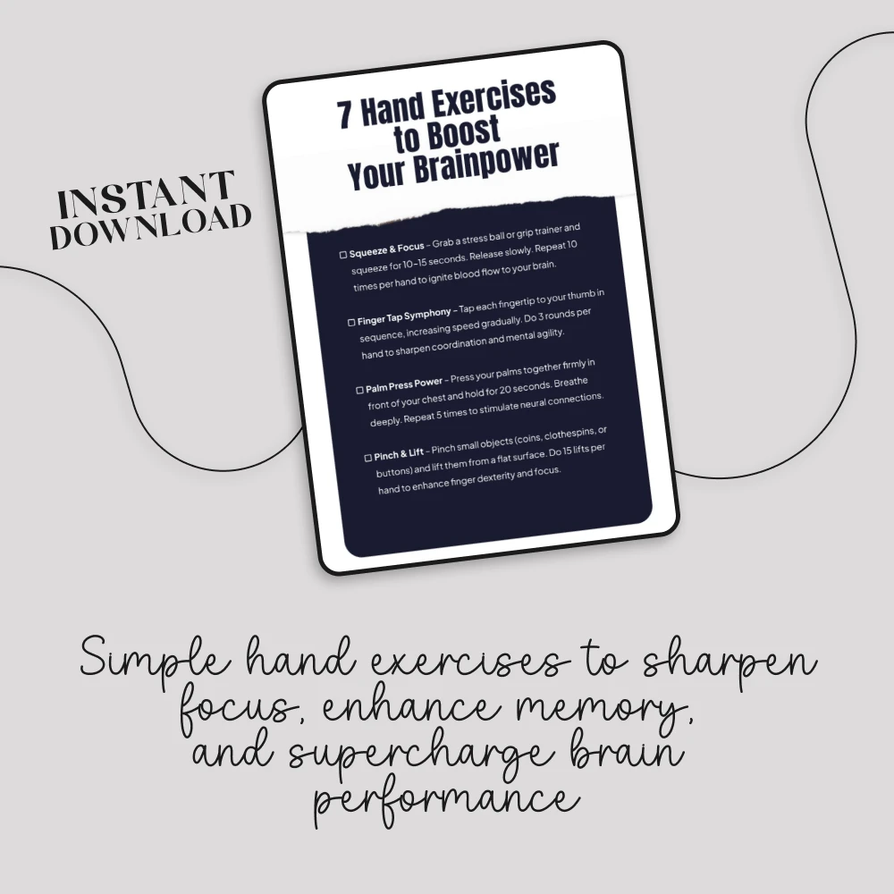 Did you know your hands can unlock sharper focus, stronger memory, and better mental agility? The 7 Hand Exercises to Boost Your Brainpower checklist is a quick, practical digital resource designed to do exactly that. With just a few minutes a day, you can use these simple hand grip exercises for brain boost to stimulate blood flow, improve coordination, and refresh your mind—anytime, anywhere. Whether you’re at your desk, on a break, or winding down at night, these exercises turn your hands into powerful tools for cognitive fitness.