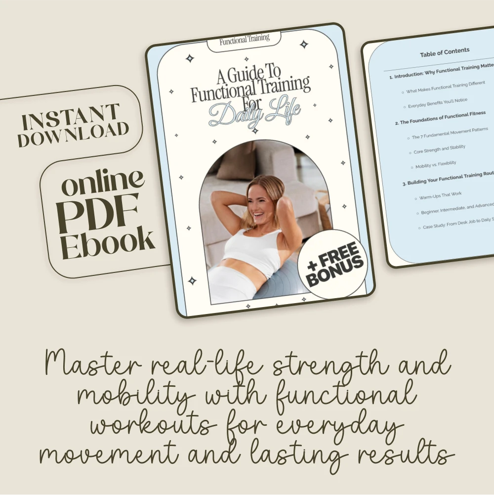 Discover how to move better, feel stronger, and thrive in your daily life with A Guide to Functional Training for Daily Life — your all-in-one Functional Fitness eBook designed for real people and real results. Whether you’re picking up groceries, chasing after kids, or working a desk job, this digital download helps you build practical strength, improve mobility, and develop lasting habits that support your everyday activities. Perfect for beginners and fitness enthusiasts alike, this guide bridges the gap between gym workouts and functional movement you can actually use.