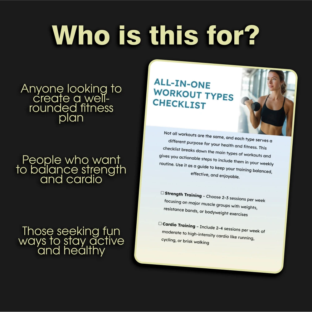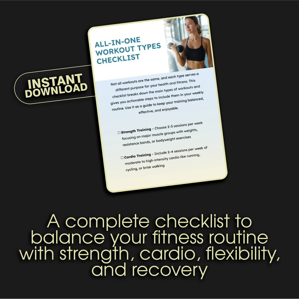 Don’t let another week pass by with an imbalanced or boring workout routine. Download the All-in-One Workout Types Checklist now and start building the fitness routine you’ve always wanted. Whether you’re looking to get stronger, increase endurance, improve flexibility, or recover faster, this guide will give you the tools you need for success. Stay on track, stay motivated, and most importantly, enjoy your workouts!