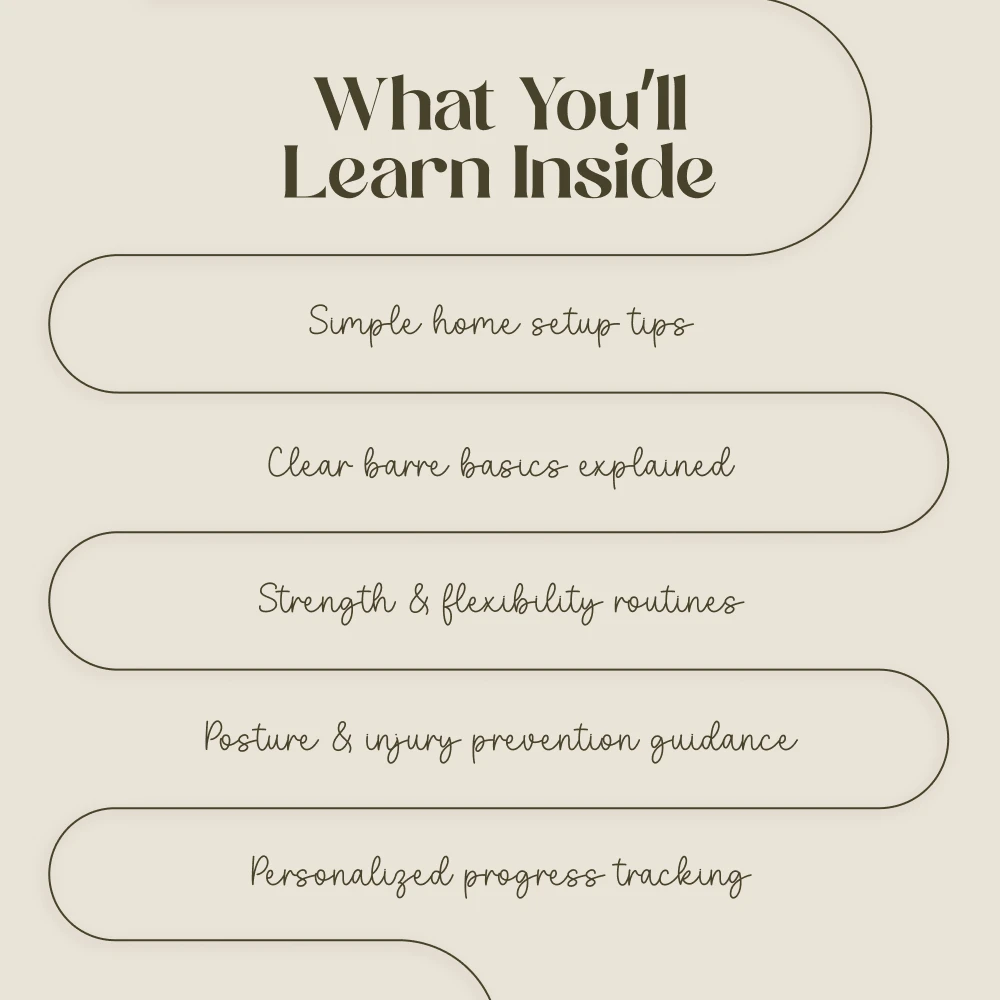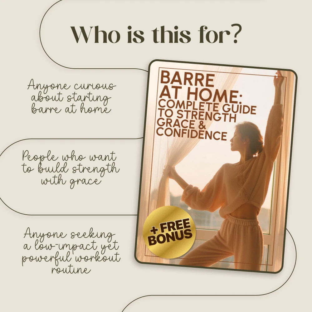 Bring the studio experience into your living room with Barre at Home: Complete Guide to Strength, Grace & Confidence — a digital guide designed to help you build strength, flexibility, and confidence with every movement. Whether you’re a beginner curious about ballet barre for home or an experienced fitness enthusiast looking for a new challenge, this guide makes it easy to transform your workout space into a powerful training studio.