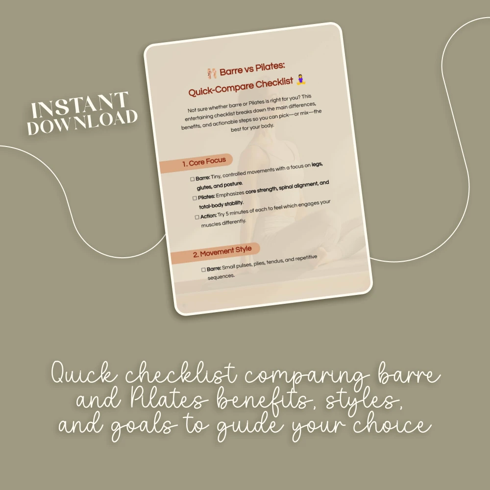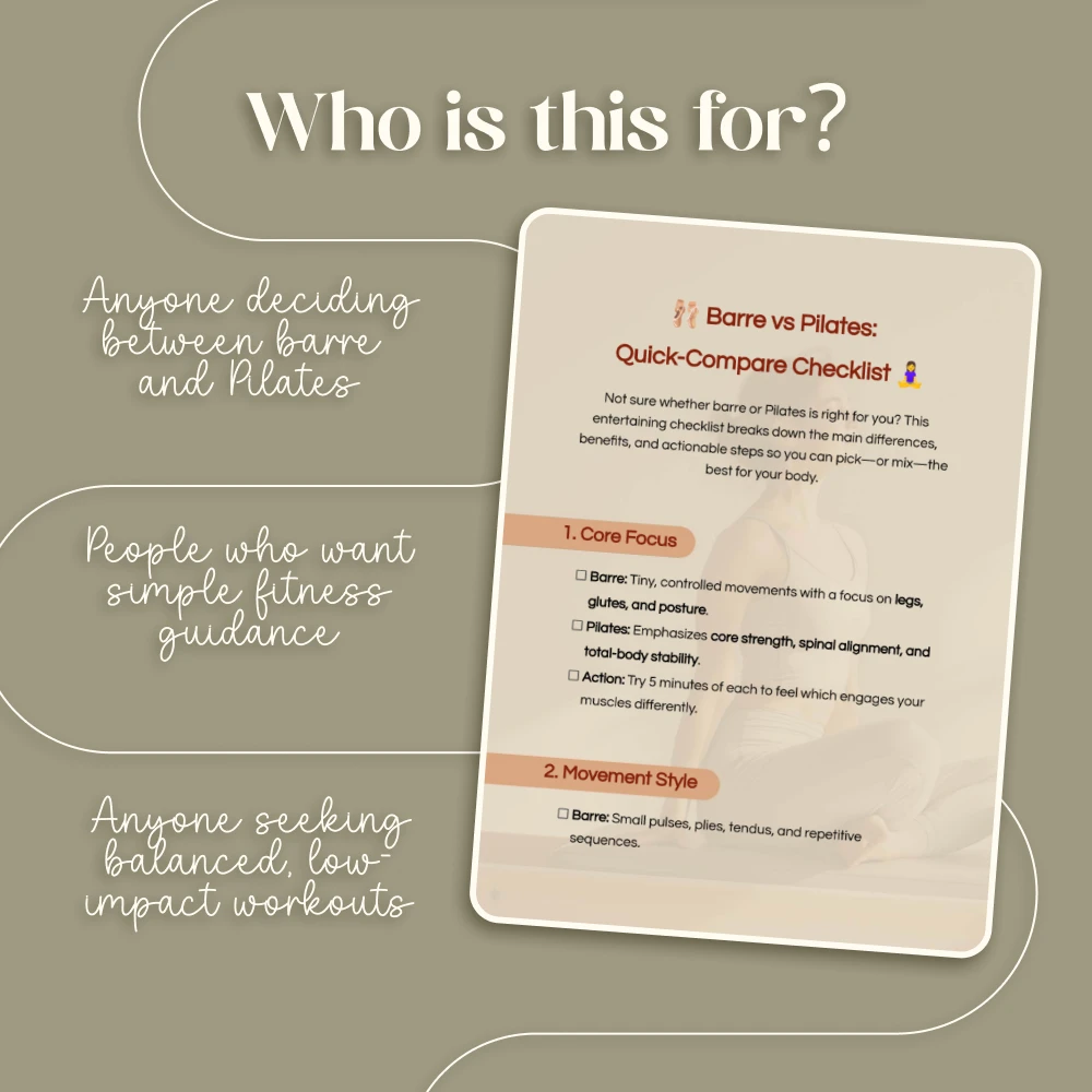 This barre vs pilates digital checklist is perfect for fitness beginners, busy professionals who want clarity, or anyone curious about blending two effective workout styles. If you’ve been searching for a resource that goes beyond generic workout advice, this is the quick, actionable guide you need.