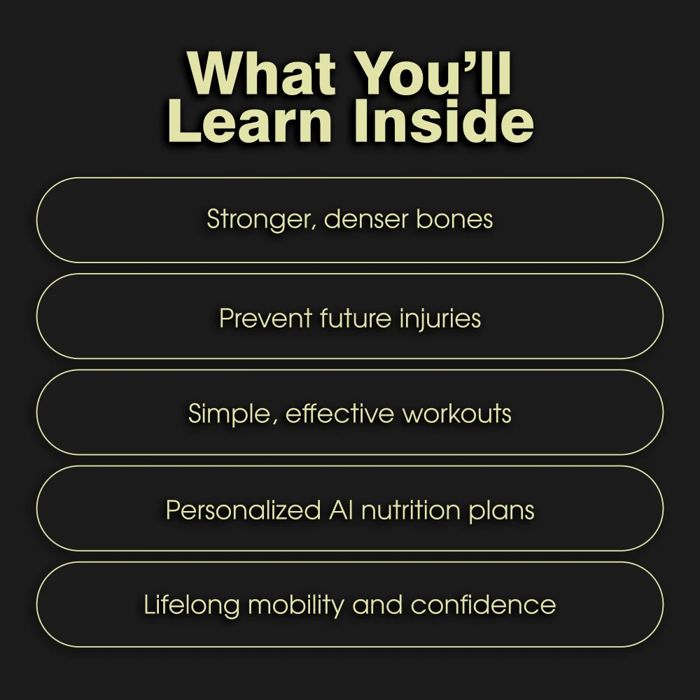 - Chapter 2: Nutrition & Lifestyle – Discover the building blocks of strong bones. Learn about the Key Nutrients for Bone Health, integrate Daily Habits That Support Longevity, and get inspired by a real-world Case Study: Sarah’s 6-Month Bone Boost.