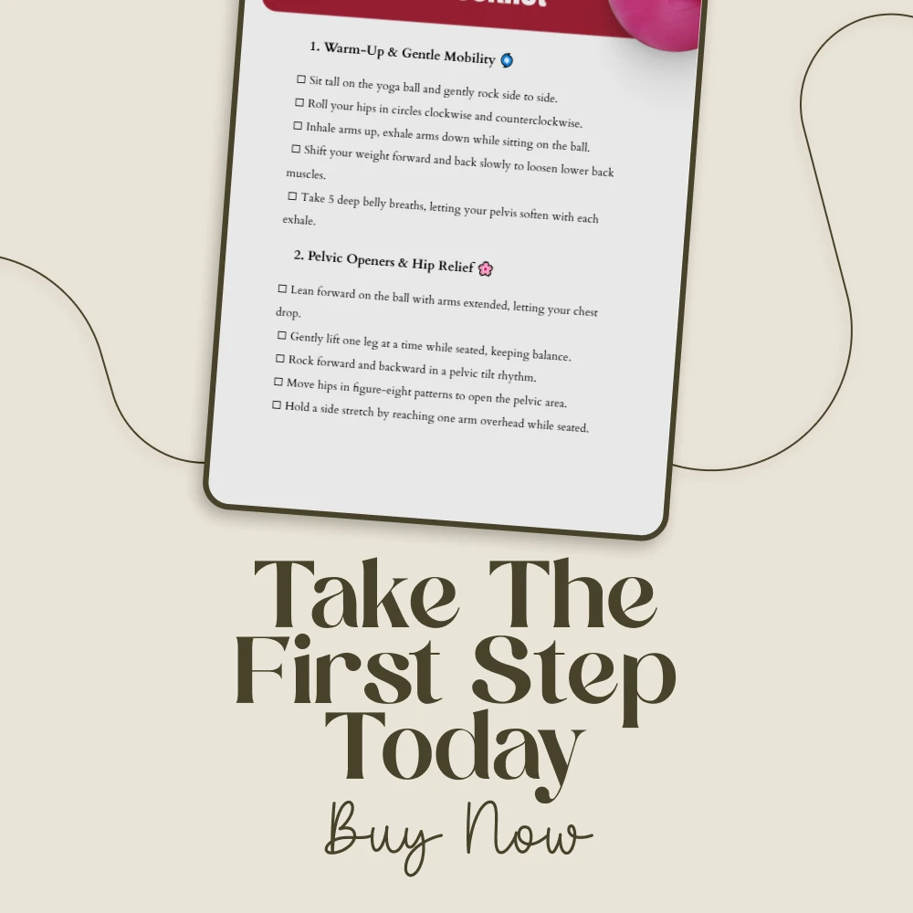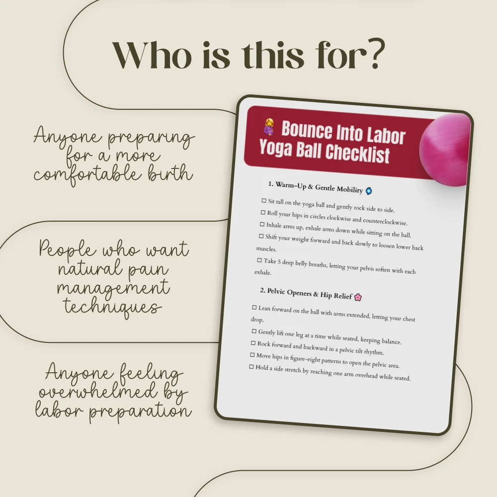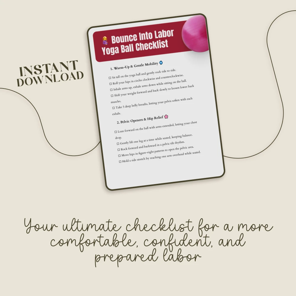 Imagine moving through your pregnancy and labor with more comfort, confidence, and control. Your yoga ball is more than just a piece of equipment; it’s your partner in preparing your body for the beautiful journey of birth. Our Bounce Into Labor Yoga Ball Checklist is your essential, easy-to-follow digital guide, packed with purposeful yoga ball labor exercises designed to ease aches, encourage optimal baby positioning, and help you feel empowered and prepared. This isn’t just a list—it’s your roadmap to using simple, proven movements to support your body during this incredible time.