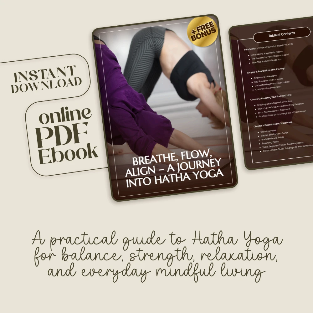 Step into the world of balance, awareness, and transformation with Breathe, Flow, Align – A Journey into Hatha Yoga. This beautifully designed ebook is your complete guide to understanding and practicing hatha yoga, offering clear explanations, practical routines, and inspiring case studies. Whether you’re just starting out or looking to deepen your current practice, this digital download is an easy-to-follow companion for anyone seeking physical strength, inner calm, and mindful living.
