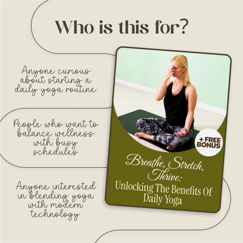 This guide is perfect for beginners who want a clear starting point, busy professionals seeking balance, or anyone curious about blending yoga with modern AI tools. Unlike other eBooks, it goes beyond generic advice by offering tech-enhanced strategies and real-life stories, making it practical and relatable.