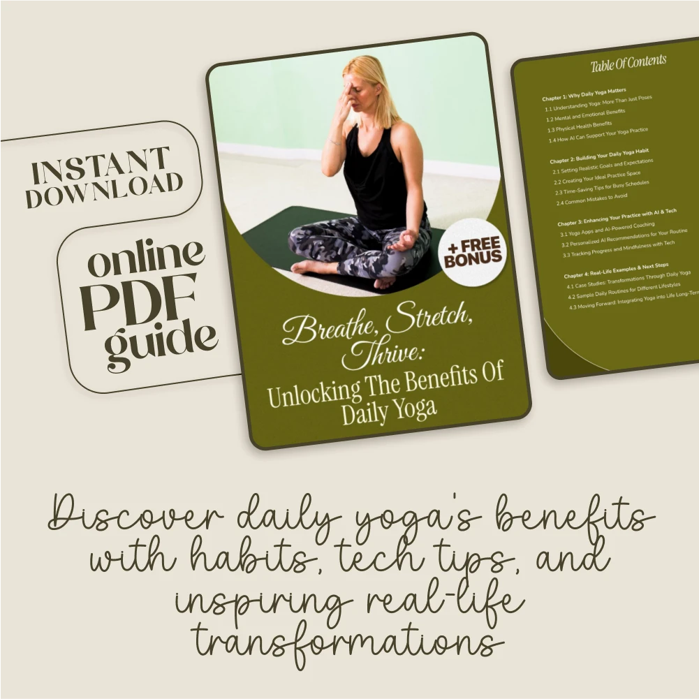 Transform your well-being with Breathe, Stretch, Thrive: Unlocking the Benefits of Daily Yoga, a powerful digital guide designed to help you build a consistent yoga practice. Whether you’re brand-new to yoga or looking to deepen your daily routine, this downloadable eBook is your complete roadmap to better physical health, mental clarity, and emotional resilience. With practical steps, inspiring real-life examples, and even insights on how AI can support your journey, this guide blends ancient wisdom with modern tools for a balanced lifestyle.