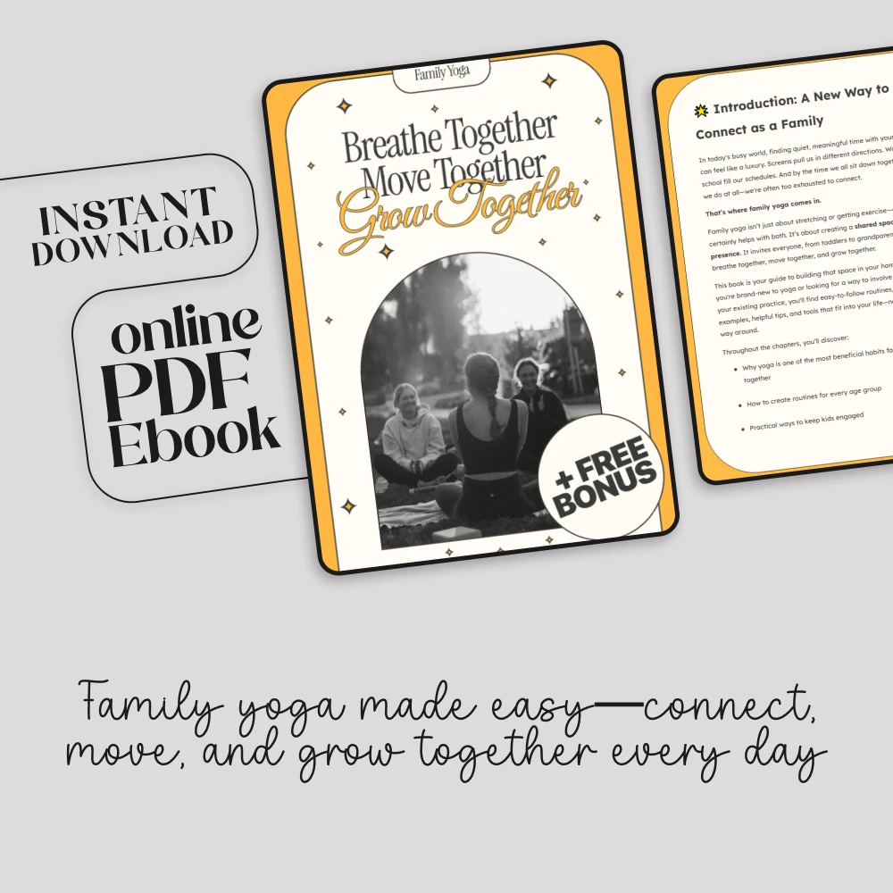 Discover a joyful, heart-centered way to bring your family closer with Breathe Together Move Together Grow Together — a beautifully designed family yoga routines eBook that helps parents and kids create meaningful moments through movement, mindfulness, and play. Whether you’re looking to replace hectic mornings with calm, strengthen bonds through fun routines, or introduce mindful habits that grow with your children, this digital download gives you everything you need to begin your journey together — one breath, one pose, one shared smile at a time.