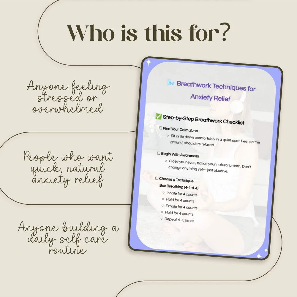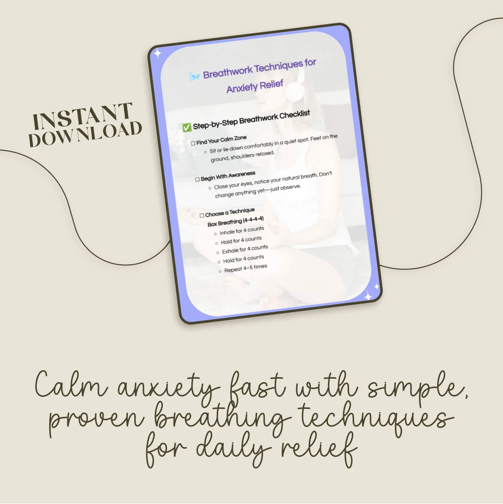Don’t let anxiety control your day. Download Breathwork Techniques for Anxiety Relief now and carry the power of calm with you wherever you go. Instant access, instant relief.