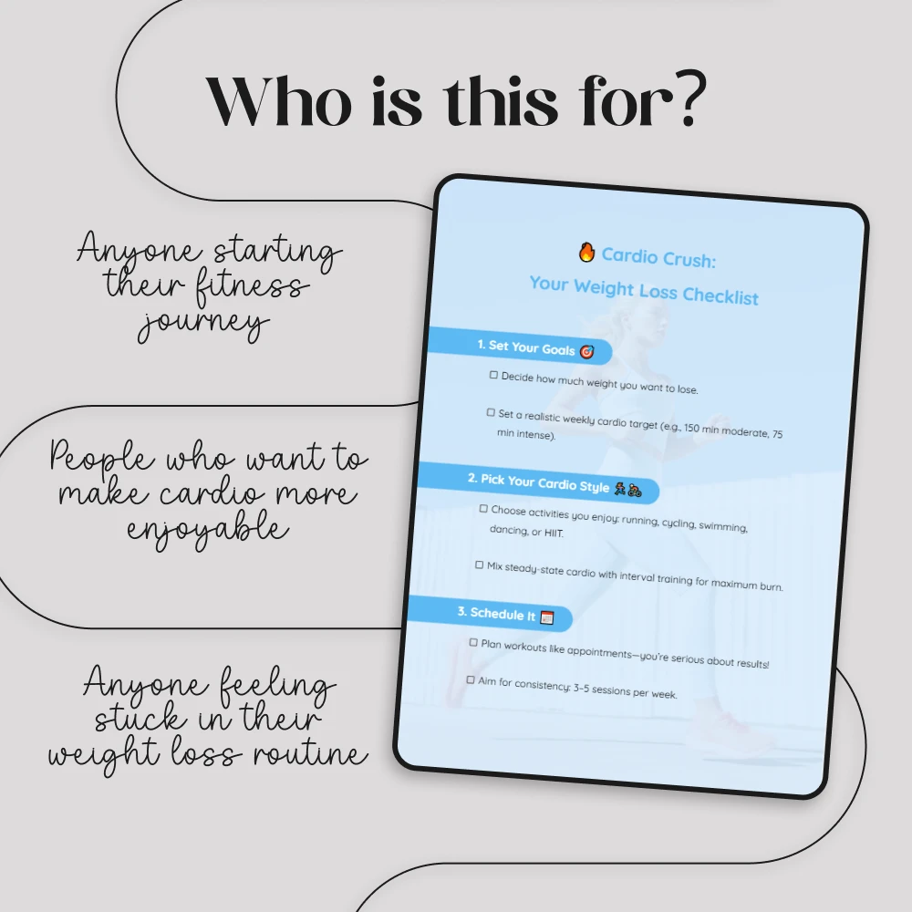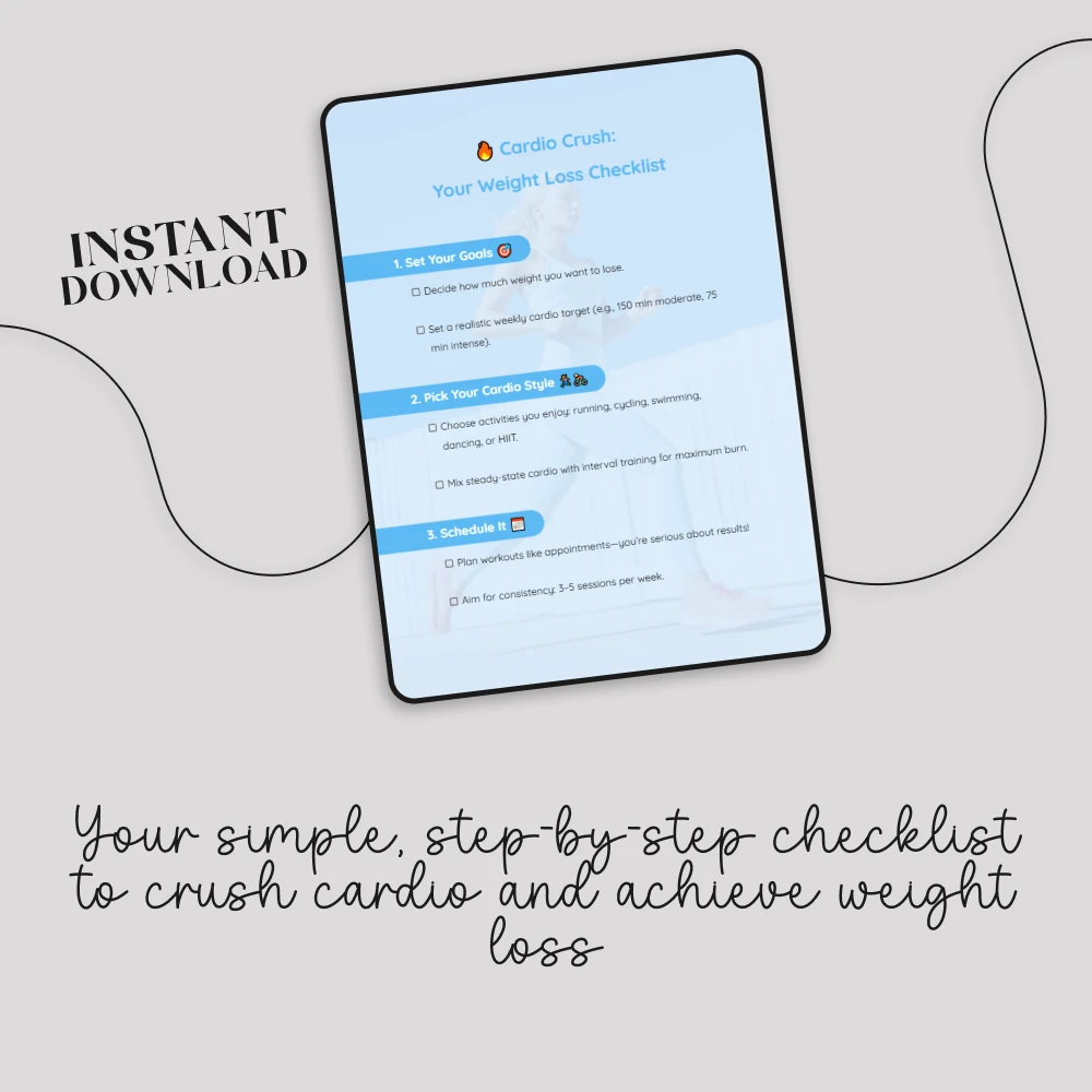 Click “Add to Cart” now to instantly download “Cardio Crush: Your Weight Loss Checklist” and start crushing your goals today!