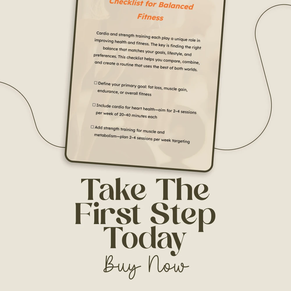 Stop letting confusion hold you back from the body and energy levels you deserve. This instant digital download means you can get started on your transformed fitness journey within minutes. For less than the cost of a protein shake, you can have a lifetime of clarity on how to structure your workouts for maximum results. Click “Add to Cart” now to download your Cardio vs Strength Training Checklist and finally create the balanced, effective fitness routine you’ve been searching for!