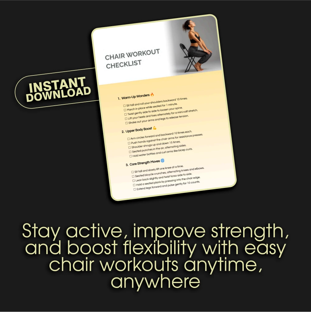 This digital guide is perfect for anyone looking to improve their fitness without needing a lot of space or equipment. Ideal for desk workers, seniors, people with limited mobility, or anyone who prefers low-impact exercises, the Chair Workout Checklist provides: