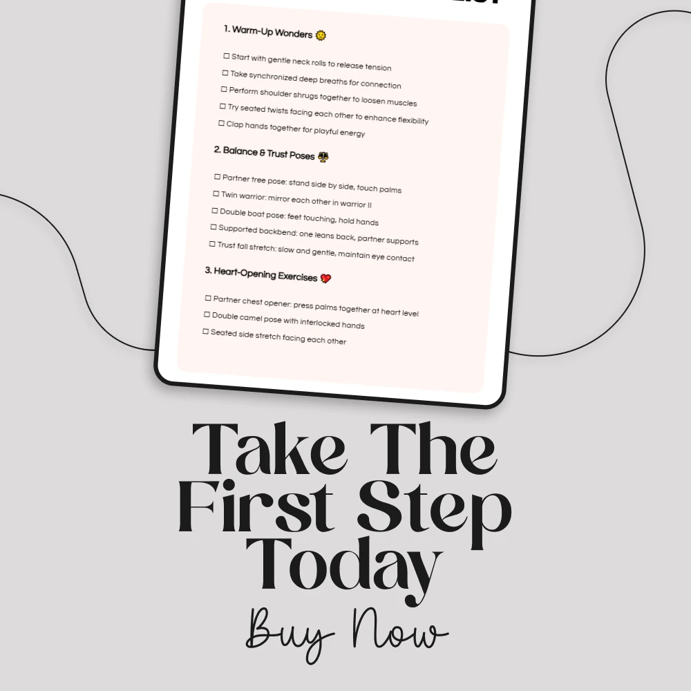 This comprehensive checklist is your step-by-step roadmap to a shared yoga experience. It’s thoughtfully organized into themed sections that guide you from warm-up to cool-down, ensuring a safe, fun, and deeply rewarding practice every time.
