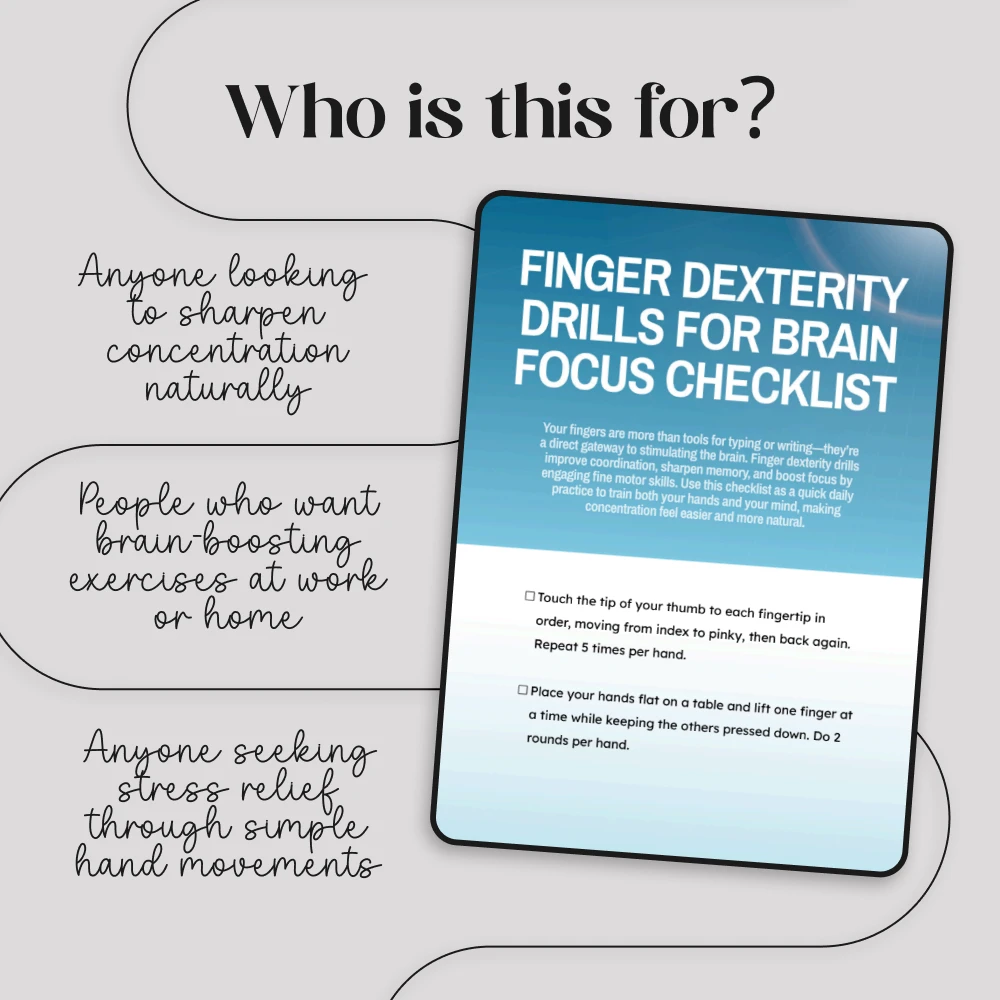 Don’t let distractions slow you down. Download the Finger Dexterity Drills for Brain Focus Checklist today and give your brain the workout it deserves. Easy to follow, quick to practice, and powerful in results — your sharper focus is just a click away.