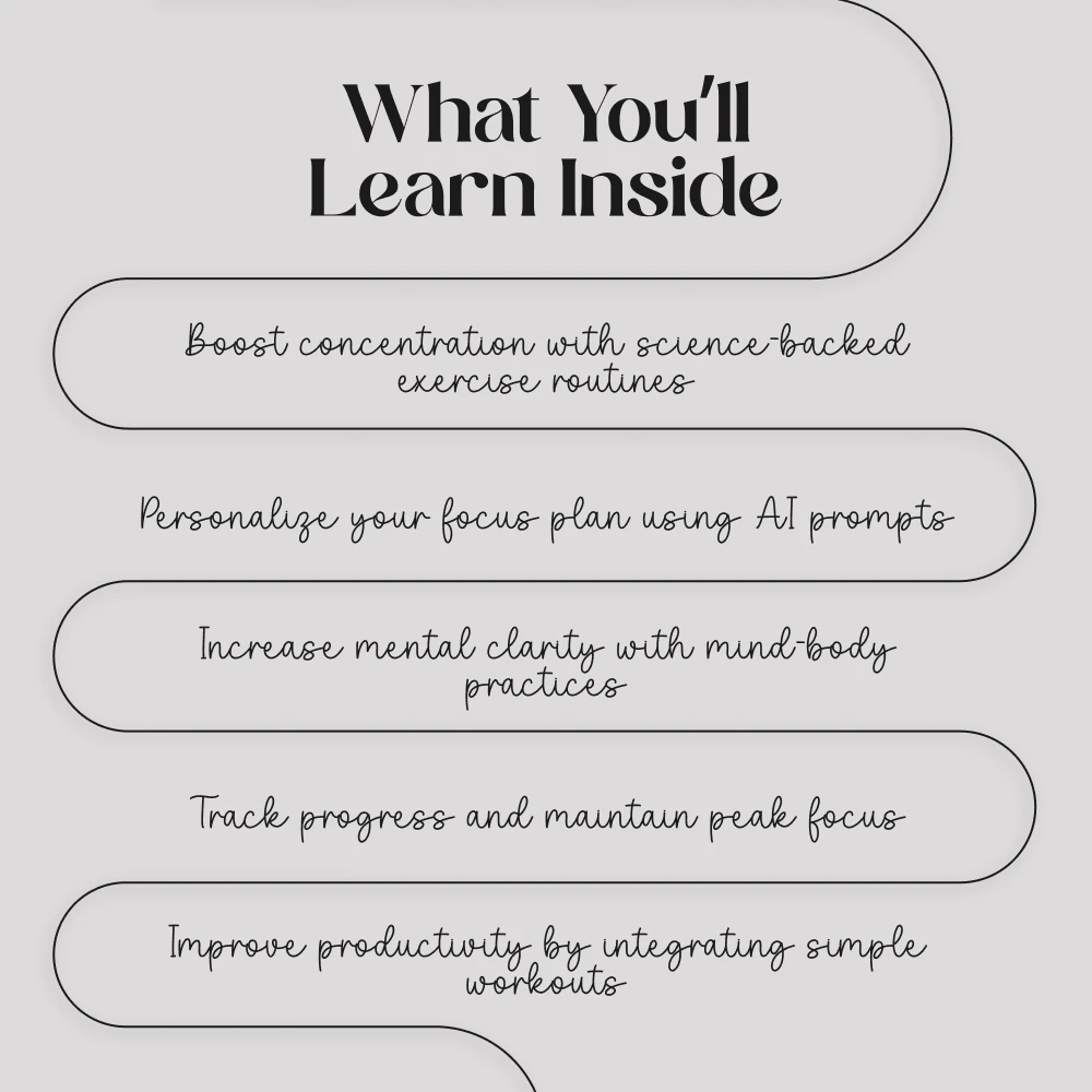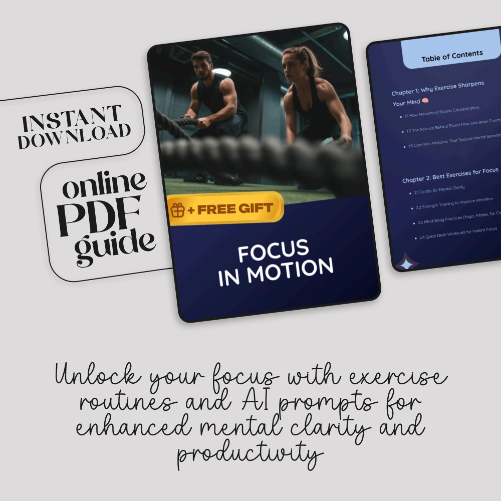 Don’t let distractions and mental fog hold you back. With *Focus in Motion*, you have the tools, strategies, and exercises to stay sharp, energized, and focused every day. Download your copy today and start transforming your mental clarity with the perfect blend of exercise and AI-powered tools!