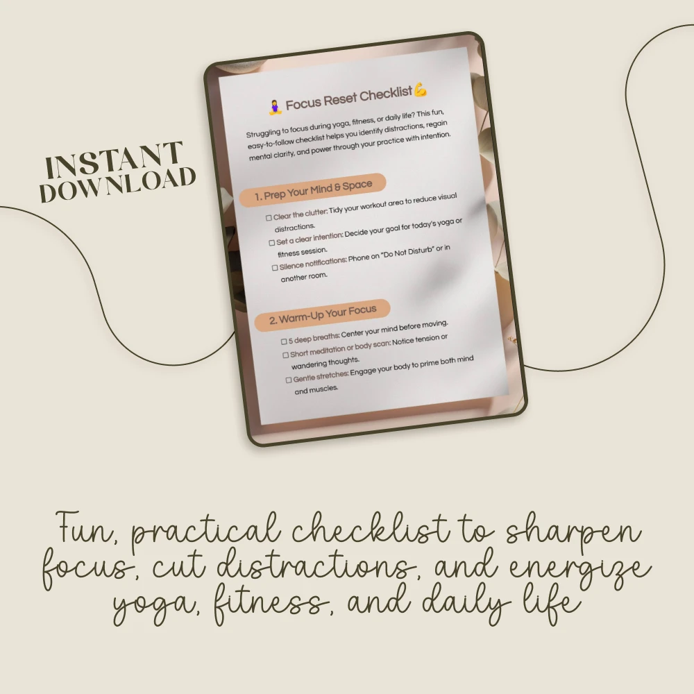 Struggling to stay present during yoga, workouts, or even daily life? If you’ve ever caught yourself asking, why can’t I focus, this digital Focus Reset Checklist is your go-to solution. Designed for anyone who feels distracted, restless, or mentally scattered, this easy-to-follow guide helps you reset your attention and regain mental clarity. With practical, bite-sized steps, you’ll learn how to prepare your space, warm up your focus, and apply actionable techniques that keep you engaged throughout your practice—or your day.