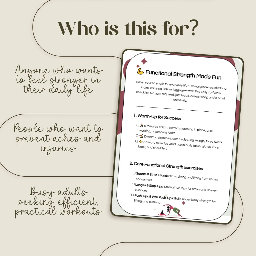 This guide is perfect for busy adults who want to stay active without a complicated routine, seniors looking to maintain independence and prevent falls, office workers combating a sedentary lifestyle, and anyone who wants to feel stronger and more resilient while performing their functional strength for daily tasks. If you want a practical, no-fluff resource that delivers real-world results, this is for you.