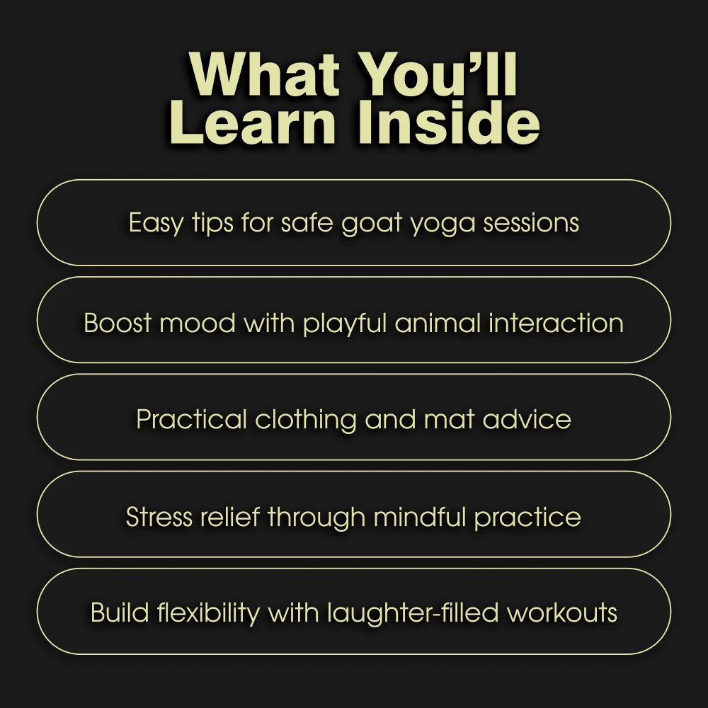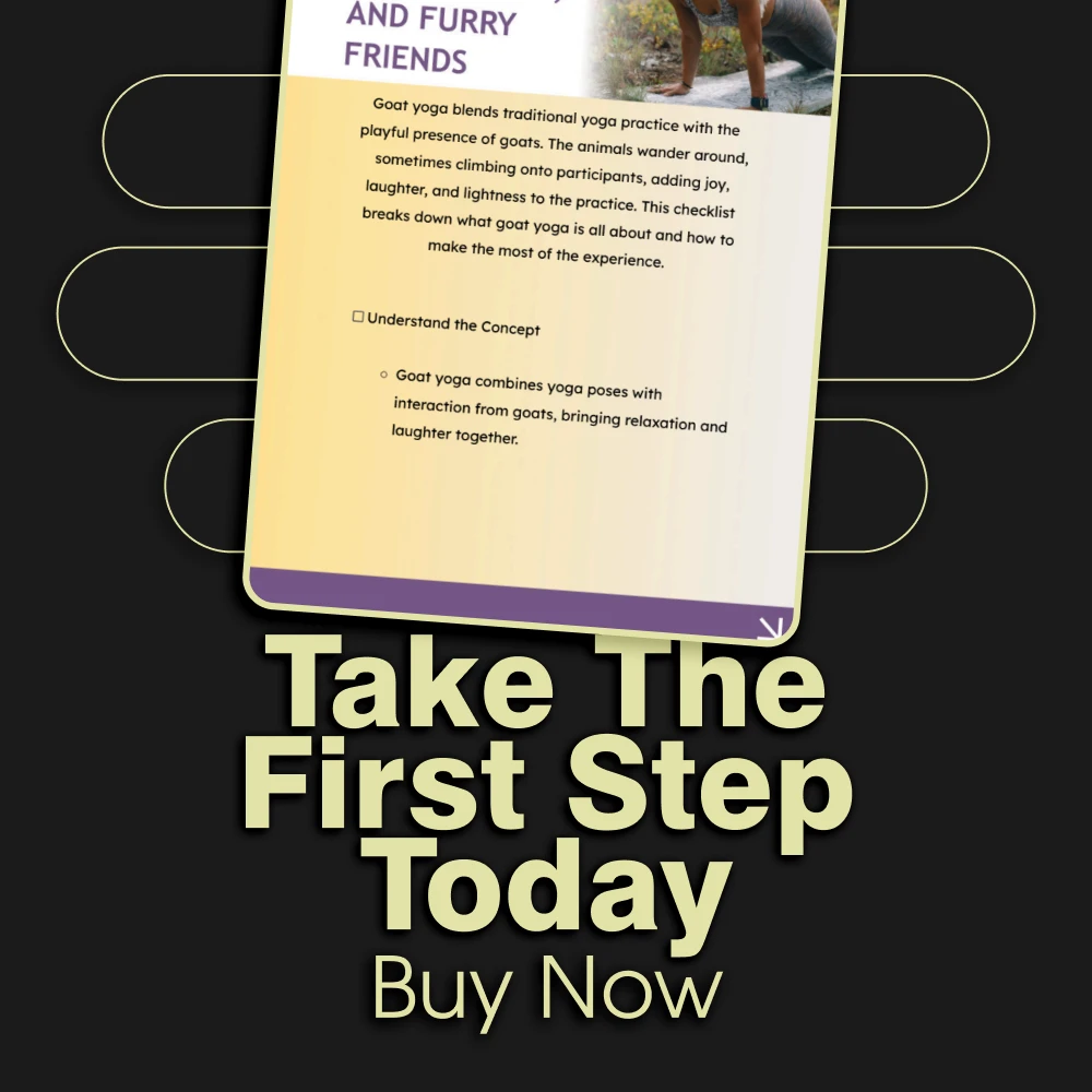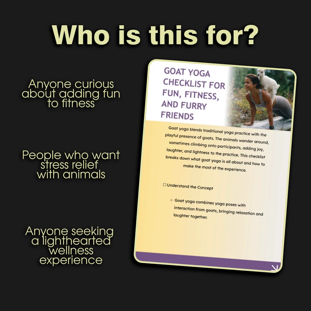 This checklist is perfect for anyone curious about goat yoga, whether you’re brand-new to yoga, a fitness enthusiast looking for a playful twist, or someone who loves animals and wants to try something different. It’s designed to be clear, simple, and welcoming, making goat yoga accessible to all.