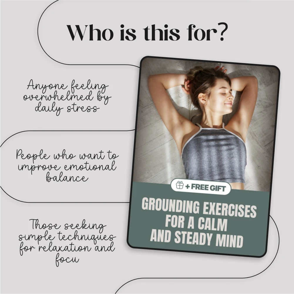 Our Grounding Exercises for a Calm and Steady Mind eBook is perfect for anyone feeling overwhelmed by the demands of daily life. Whether you’re a busy professional, a student, or someone seeking relief from stress or anxiety, this guide offers practical solutions to help you achieve a peaceful mind. Unlike other resources that may be too complex or hard to follow, this guide breaks down each technique into easy, actionable steps that you can integrate into your daily routine.