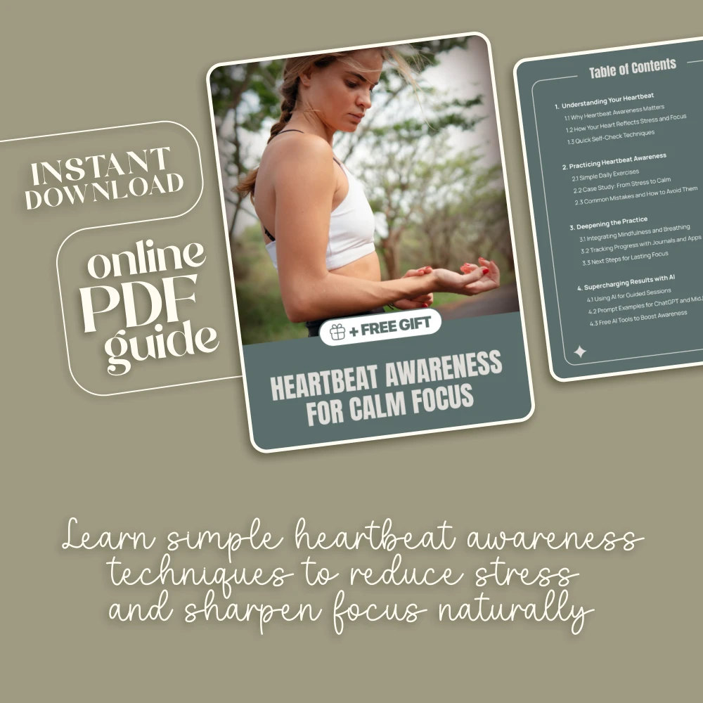 Turn stress into steady focus with Heartbeat Awareness for Calm Focus, a complete digital guide that teaches you how to connect with your heartbeat, calm your mind, and sharpen concentration. Designed for anyone seeking balance in daily life, this guide combines simple self-check techniques, mindfulness exercises, and even AI-powered support to help you achieve lasting calm and mental clarity. Whether you’re managing stress, improving focus at work, or deepening your meditation practice, this guide offers a practical, science-based approach you can use anytime, anywhere.
