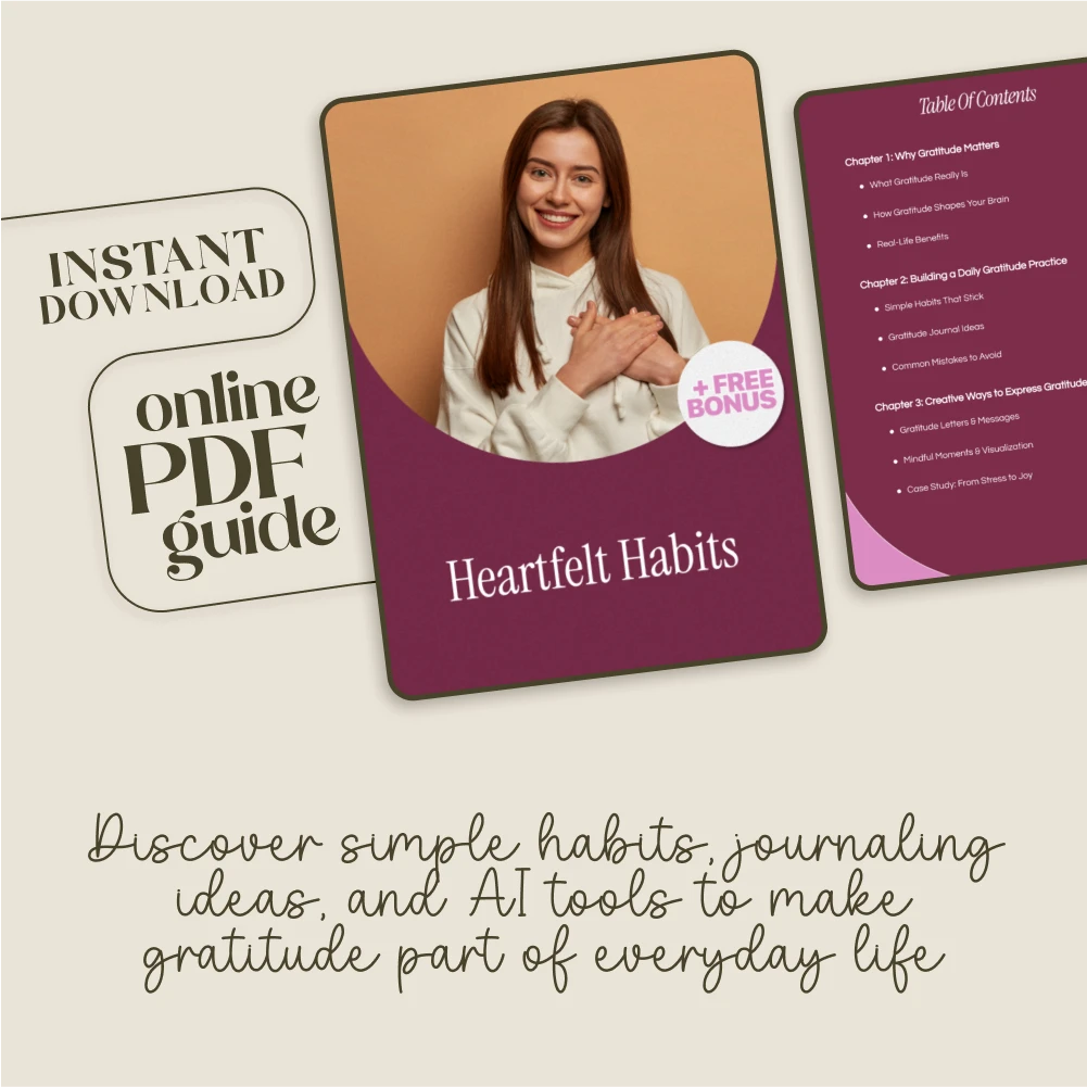 Download Heartfelt Habits now and transform how you experience each day. With easy-to-follow guidance and ready-to-use prompts, you’ll build lasting gratitude practices that bring more joy, calm, and positivity into your life. Don’t wait—make space for more gratitude today!