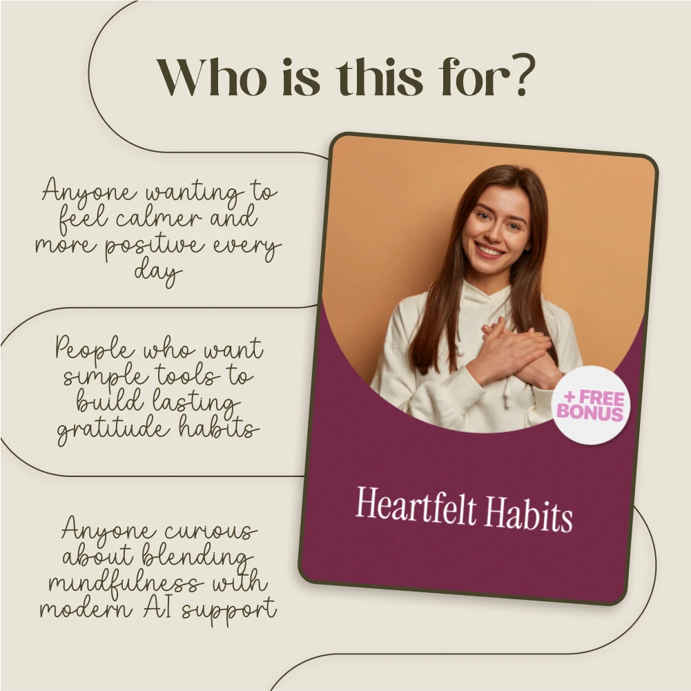 Unlike generic gratitude journals, Heartfelt Habits combines timeless practices with modern tools. You’ll find not only traditional journaling ideas but also innovative AI prompts and visual reminders that make the habit stick. It’s designed for anyone—from busy professionals to mindful beginners—who wants a straightforward, uplifting way to make gratitude part of everyday life.