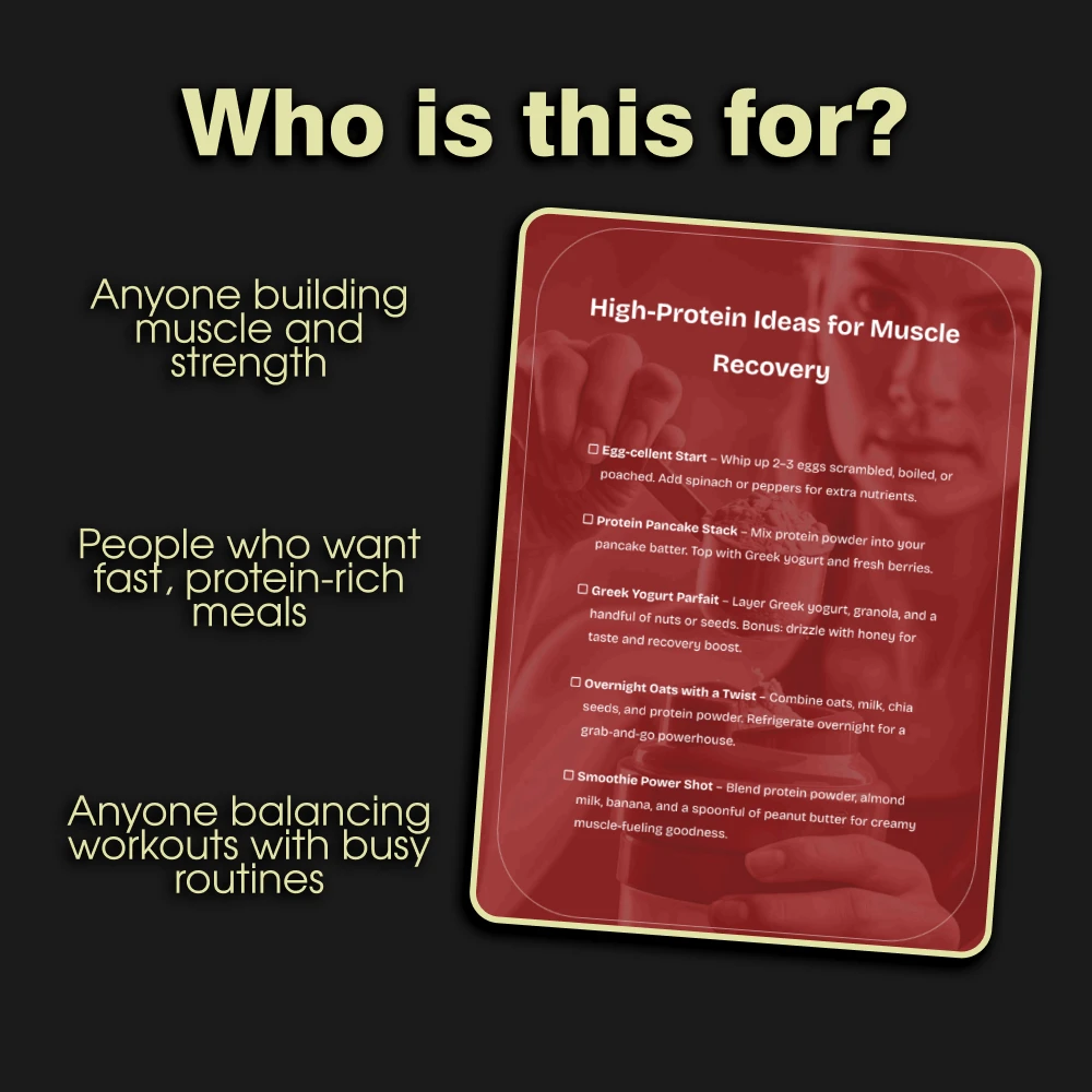 Take the guesswork out of your post-workout meals. Download the High-Protein Ideas for Muscle Recovery checklist now and fuel your body with breakfasts that help you recover faster, feel stronger, and stay energized throughout the day. Your muscles will thank you—don’t wait, start fueling smarter today!
