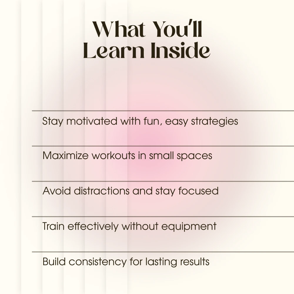 Most digital resources tell you what exercises to do, but few prepare you for the obstacles that can derail your progress. This checklist is different: it’s short, practical, and focused on turning those everyday challenges into wins. With a fun, engaging format, it gives you the motivation and tools to keep going, no matter what.