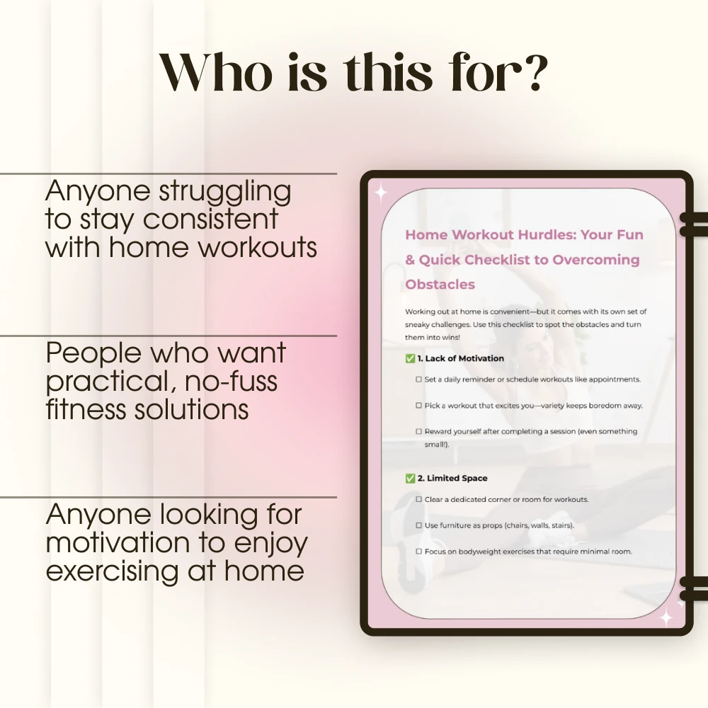 This checklist is perfect for beginners struggling to stay consistent, busy professionals balancing tight schedules, or anyone frustrated by the common obstacles in home workouts. Unlike generic fitness guides, it focuses specifically on the hidden challenges that sabotage at-home exercise—and provides quick, doable fixes that really make a difference.