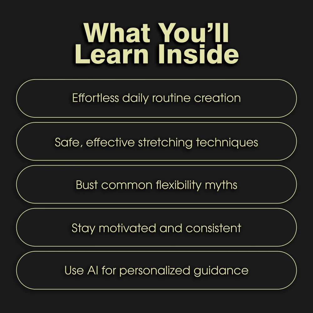 This guide was crafted for real people with busy lives. It’s perfect for the complete beginner who feels intimidated, the office worker battling desk-life stiffness, the athlete looking to enhance performance, or anyone who has tried and failed to make stretching stick. Unlike generic blog posts or confusing YouTube videos, this eBook provides a structured, step-by-step system. The unique section on Using AI for Flexibility Success sets it apart, giving you cutting-edge tools to create personalized routines and stay motivated in the digital age.