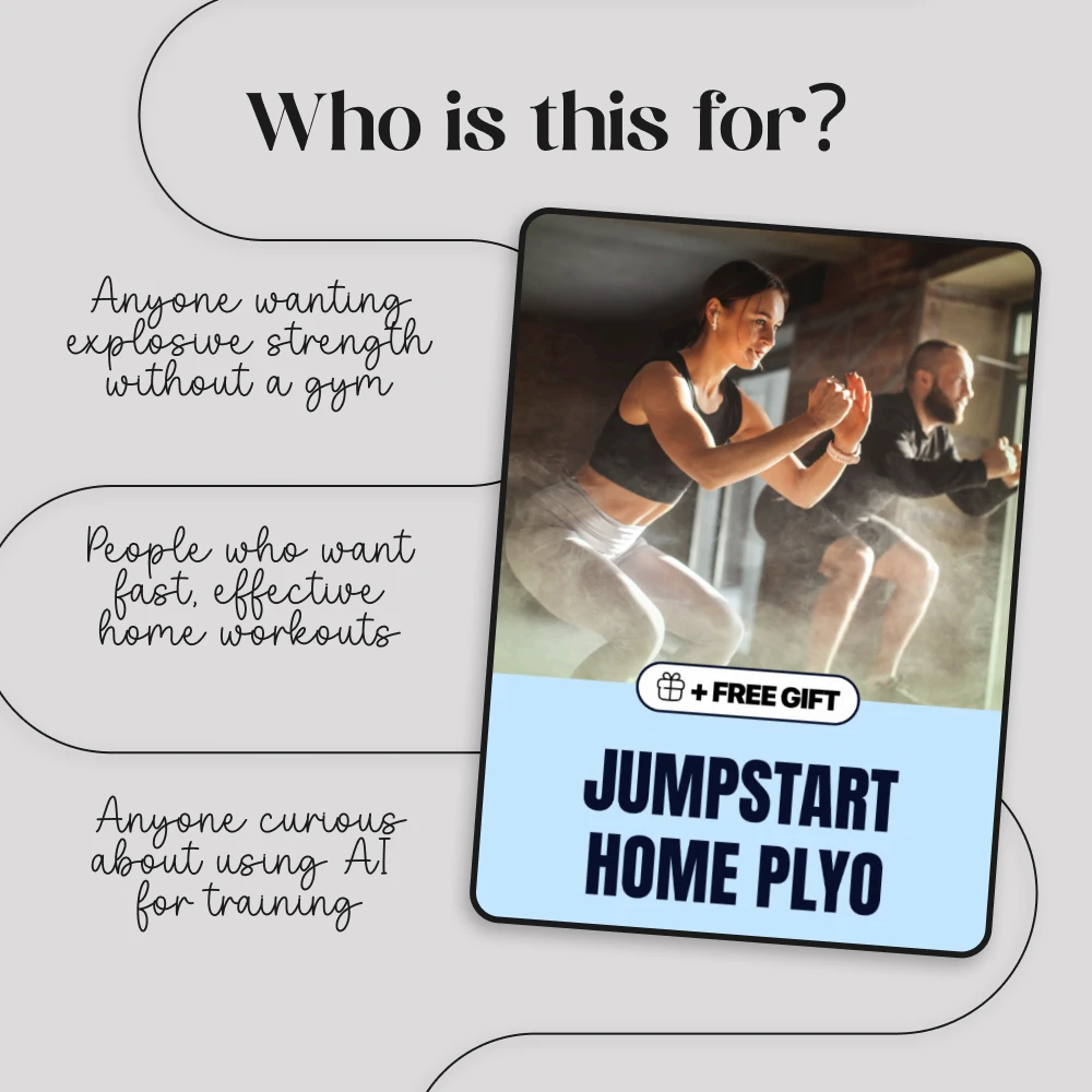 Boost your strength, agility, and explosive power without leaving your living room. Jumpstart Home Plyo💥 is a step-by-step digital guide that makes plyometric workouts you can do at home both simple and effective. Whether you’re just starting out or ready to push your limits, this guide equips you with safe, progressive routines and the tools to track real results—powered by AI prompts and easy-to-follow workouts.