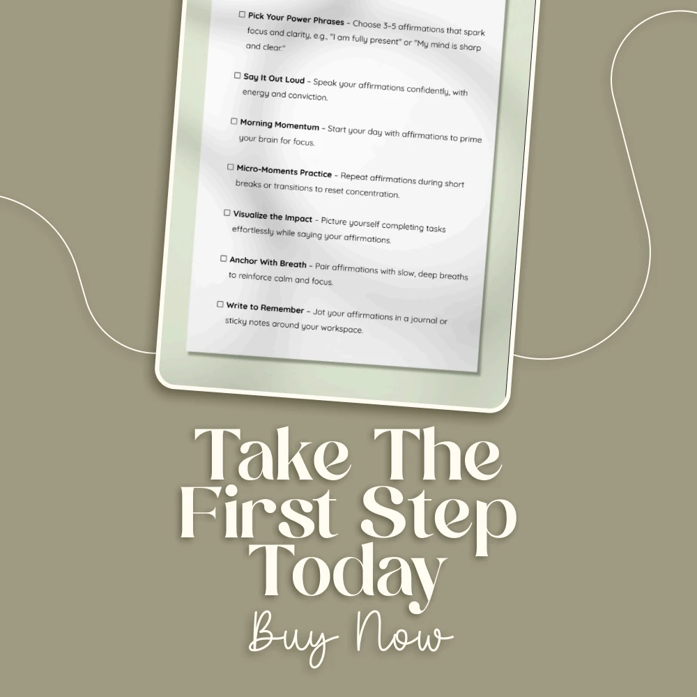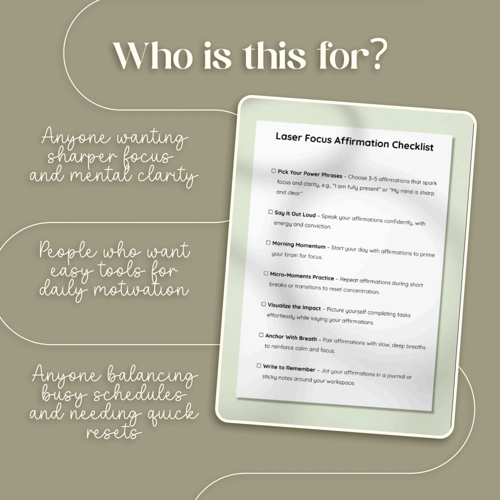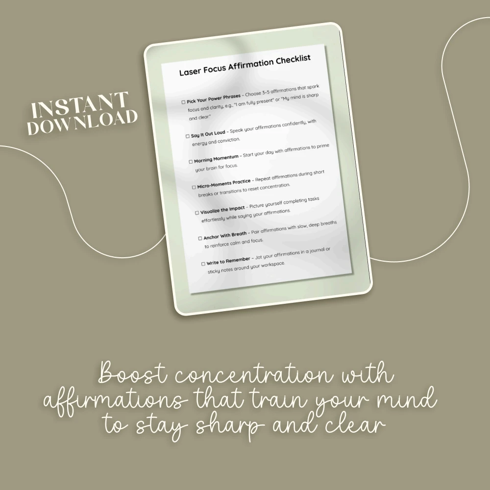 Struggling to stay on task or feeling your concentration slip away? The Laser Focus Affirmation Checklist is your simple, practical solution to cut through distractions and reclaim your mental clarity. Designed as a quick-reference digital download, this checklist shows you exactly how to use affirmations to boost concentration with easy steps you can integrate into your daily life. Whether you’re a student, professional, or entrepreneur, this tool helps you sharpen your focus, stay consistent, and achieve more with less stress.