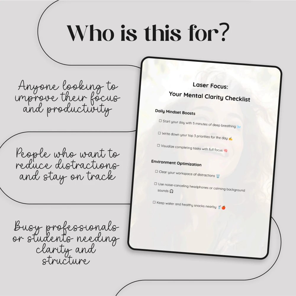 Unlike other generic productivity guides, the Laser Focus: Your Mental Clarity Checklist is designed with practical, actionable steps that you can easily implement into your daily routine. With clear instructions, focused techniques, and tips tailored to optimize both your mindset and environment, this digital resource is everything you need to build long-term habits that lead to success.