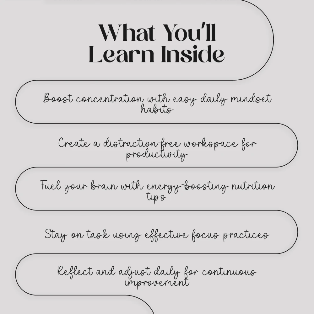 - Environment Optimization – Tips on creating a distraction-free workspace, including noise-canceling headphones and mindful background sounds.