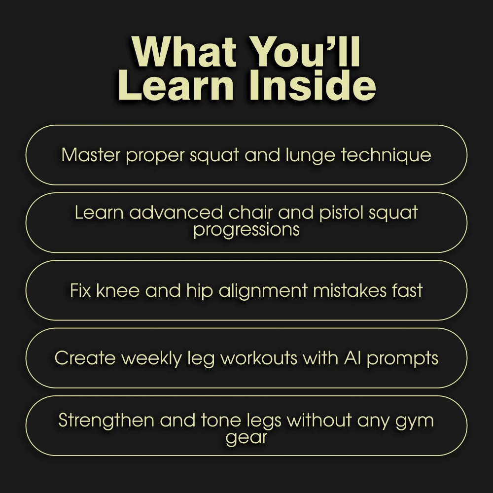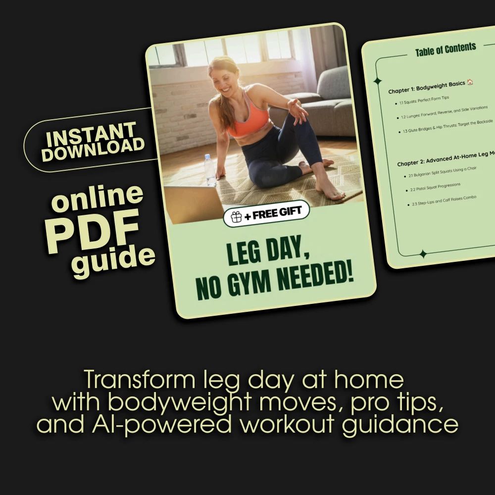 Unlike generic workout PDFs, this guide combines expert exercise instructions with cutting-edge AI prompts, making your leg day workouts at home smarter, safer, and more effective. You’ll learn how to structure your sessions, avoid common pitfalls, and stay motivated long-term—all from the comfort of your own home.