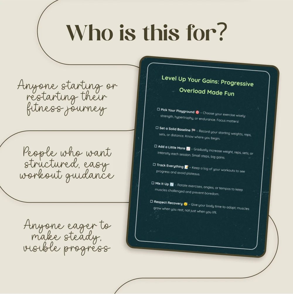 Don’t let guesswork hold you back. Download Level Up Your Gains: Progressive Overload Made Fun now and start seeing real progress — all while enjoying the process! Your next PR is just a checklist away.