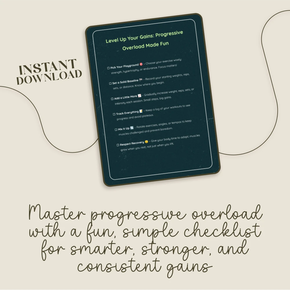 Ready to take your workouts to the next level? Level Up Your Gains: Progressive Overload Made Fun is your ultimate fitness companion — a digital download checklist designed to make strength training simple, structured, and seriously motivating. Whether you’re lifting, running, or mastering endurance, this easy-to-follow tool helps you apply the science of progressive overload in a fun, trackable way. Perfect for beginners and gym veterans alike, it turns fitness goals into achievable milestones with clear steps and satisfying progress tracking.