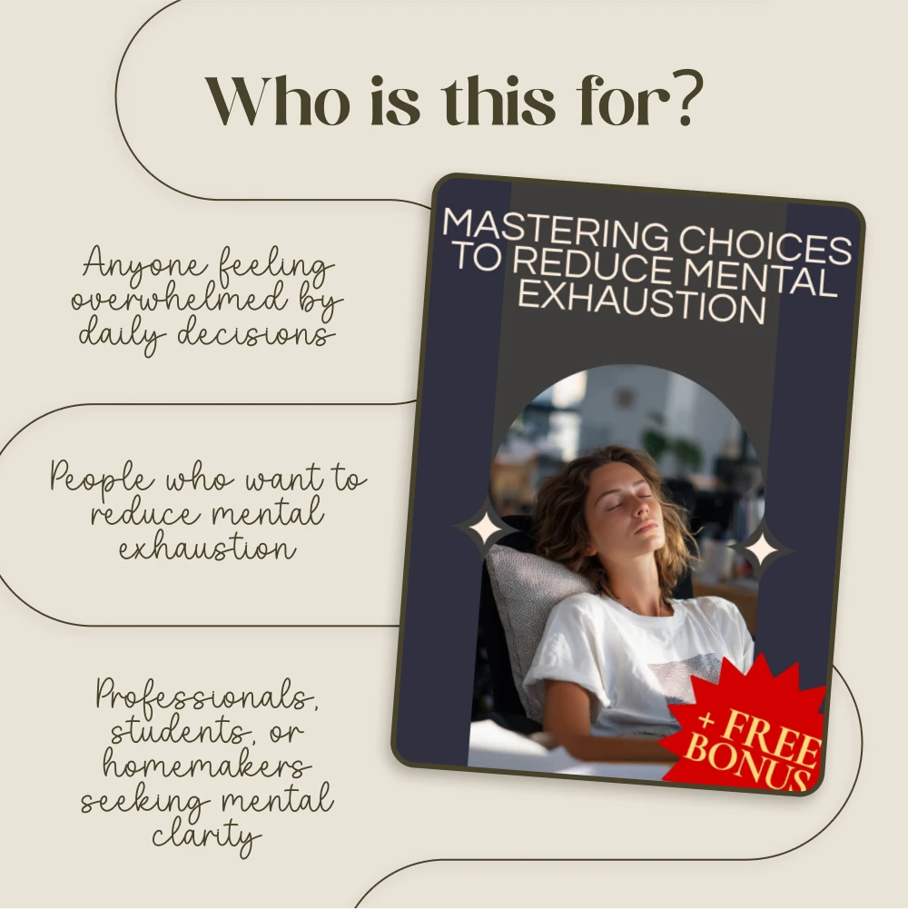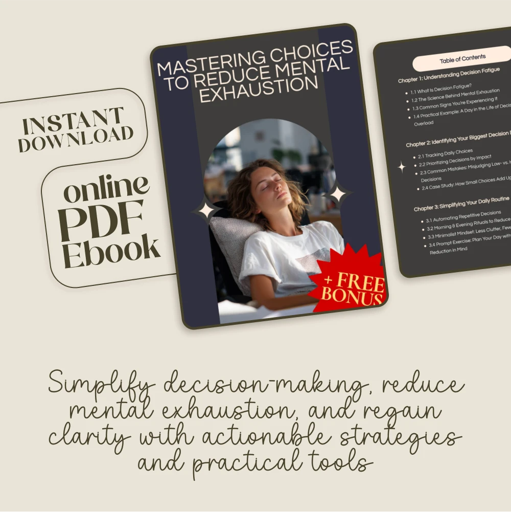 If you’re ready to simplify your decision-making process and reduce mental exhaustion, Mastering Choices to Reduce Mental Exhaustion is the guide you need. Download your copy today and start making smarter, more manageable choices that will transform your daily routine and preserve your mental energy for what truly matters!