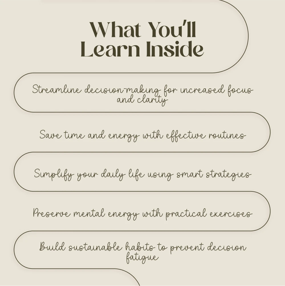 This eBook is for anyone feeling drained by daily choices—whether you’re an entrepreneur, busy professional, student, or homemaker. If you’re tired of feeling mentally exhausted and want to regain focus, energy, and clarity, this guide is for you. It’s also perfect for those looking to simplify their routines and optimize their decision-making without feeling overwhelmed.