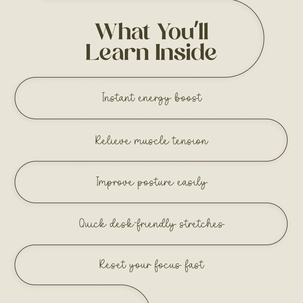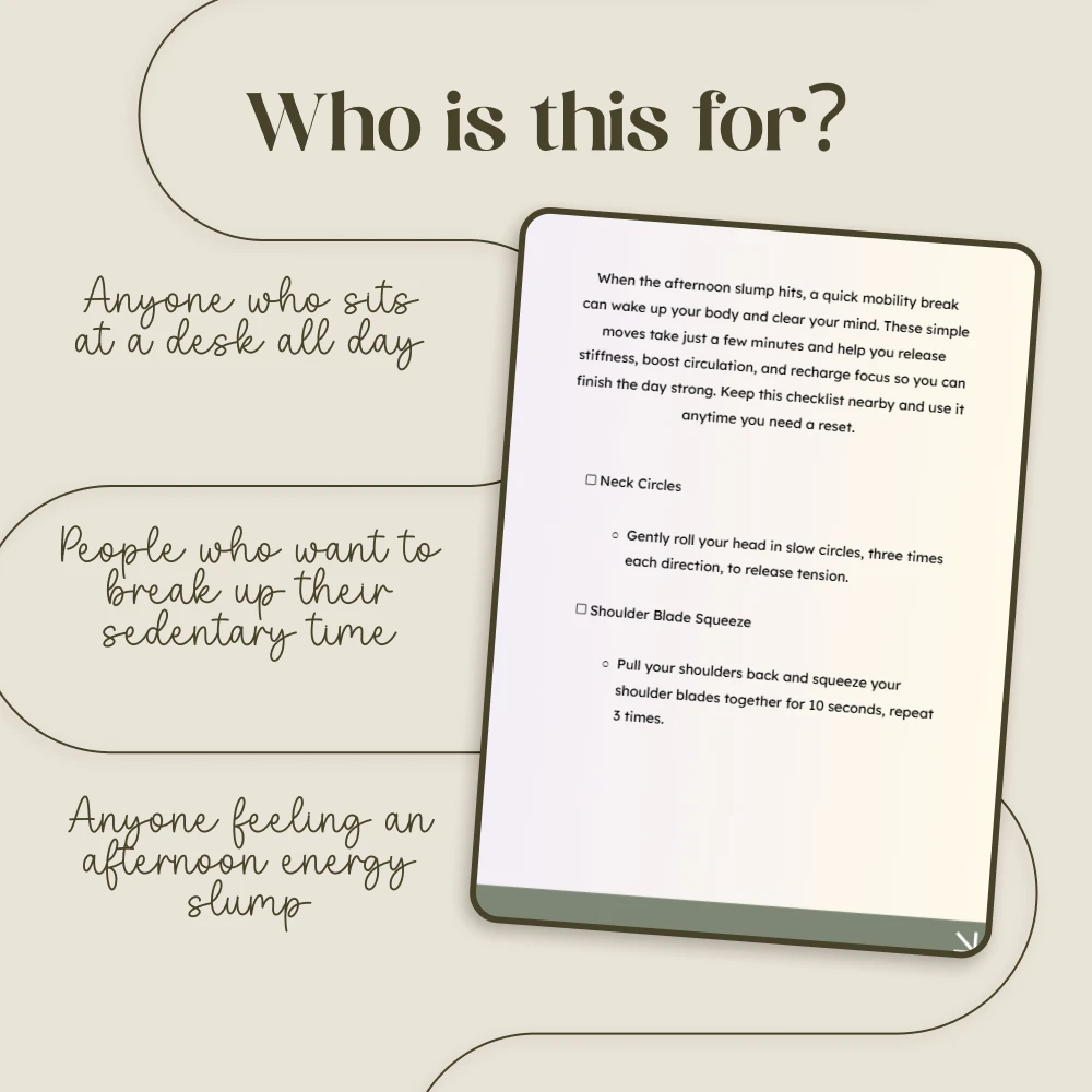 This checklist is the perfect digital companion for anyone who spends long hours at a desk. It was created for office workers, remote employees, students, and busy entrepreneurs. If you find yourself feeling stiff, sluggish, or struggling to concentrate in the afternoon, this is for you. It’s also ideal for anyone looking for a simple, no-fuss way to incorporate more movement into their sedentary routine.