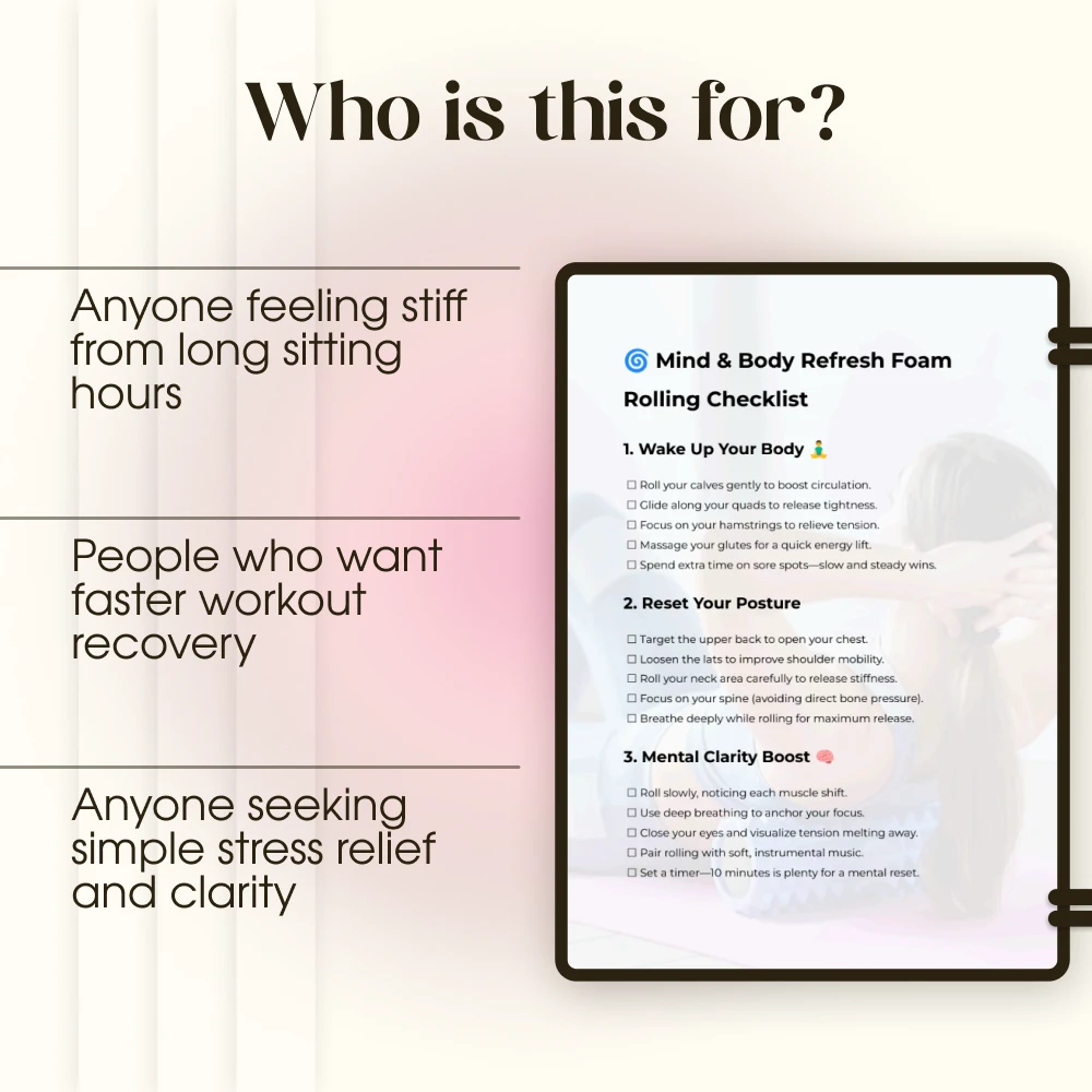 This is more than a basic list of stretches. The Mind & Body Refresh Foam Rolling Checklist combines physical relief with mental clarity, offering structured steps for both body and mind. With added guidance on using AI tools, you’ll have modern support to keep your wellness practice engaging and personalized. Perfect for busy professionals, athletes, students, or anyone who wants quick and effective ways to recharge.