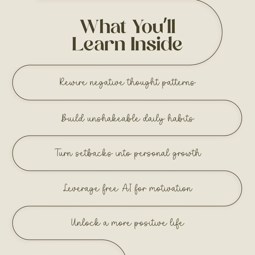 - Chapter 4: Amplifying Positivity with AI – A cutting-edge section! Learn the secrets of using ChatGPT for mindset prompts, explore creative visualization with AI tools, and get a curated list of free AI resources for daily motivation.