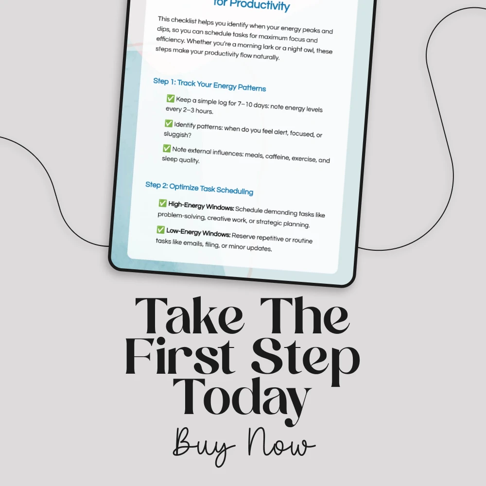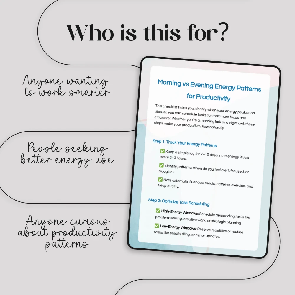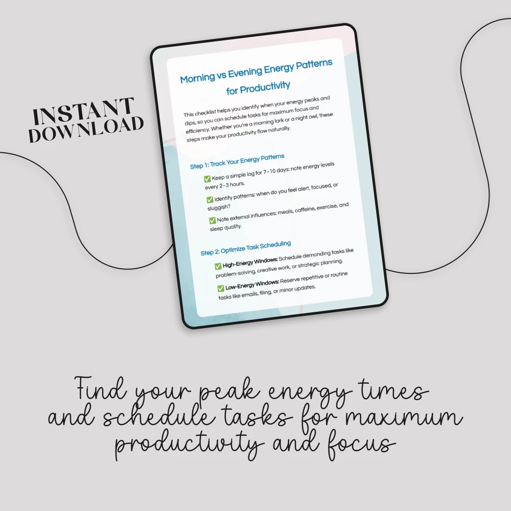 Stop forcing yourself to focus when your energy is low. Instead, align your work with your natural rhythm and achieve more in less time. Download the Morning vs Evening Energy Patterns for Productivity checklist today and start building a schedule that works with you, not against you.