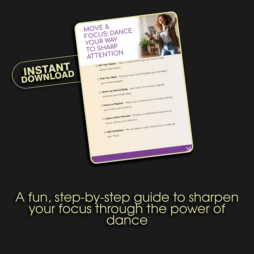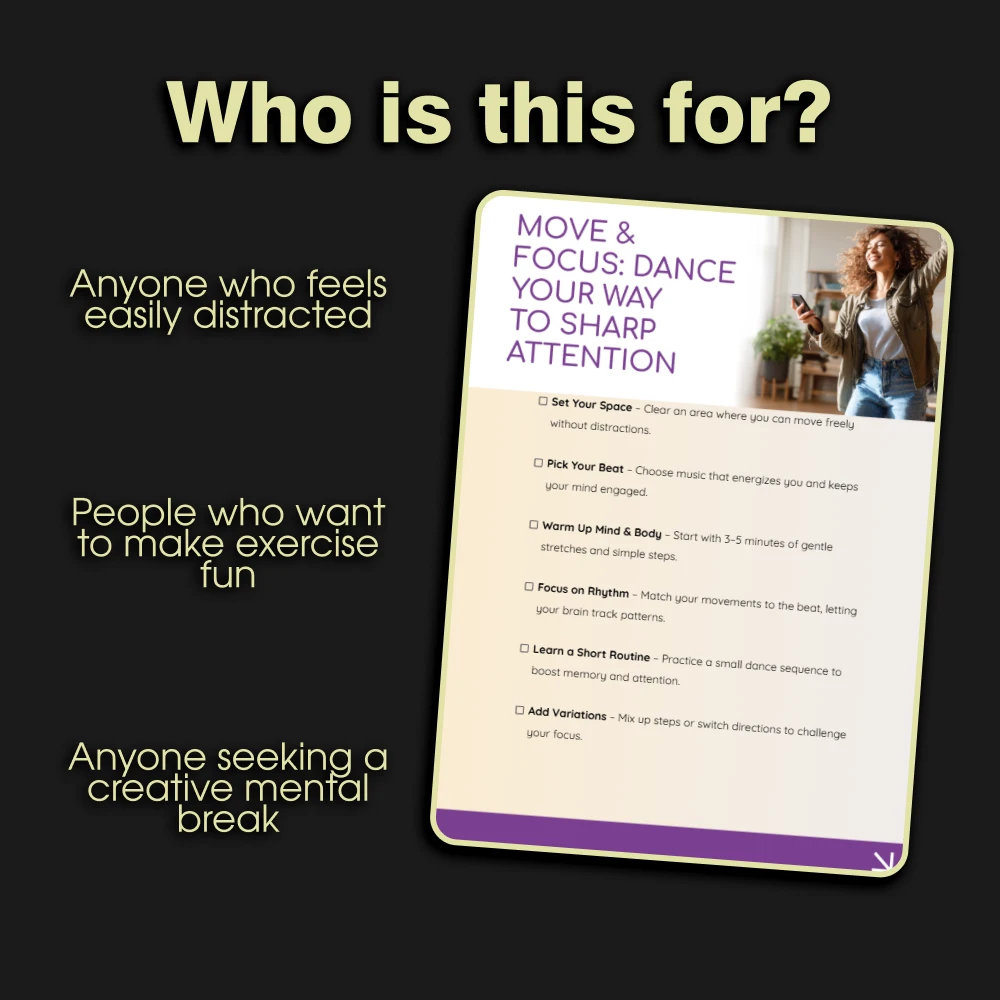 Unlike generic workout plans or dense eBooks, Move & Focus: Dance Your Way is a practical, action-oriented checklist. It’s designed for immediate implementation. The core of our method is using dance workouts for better attention, a concept that turns exercise into a powerful focus-building tool. We provide the framework; you bring the music and the willingness to move. It’s the fusion of fitness, mindfulness, and cognitive training you won’t find anywhere else.