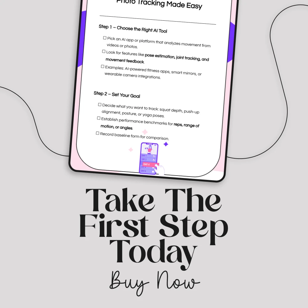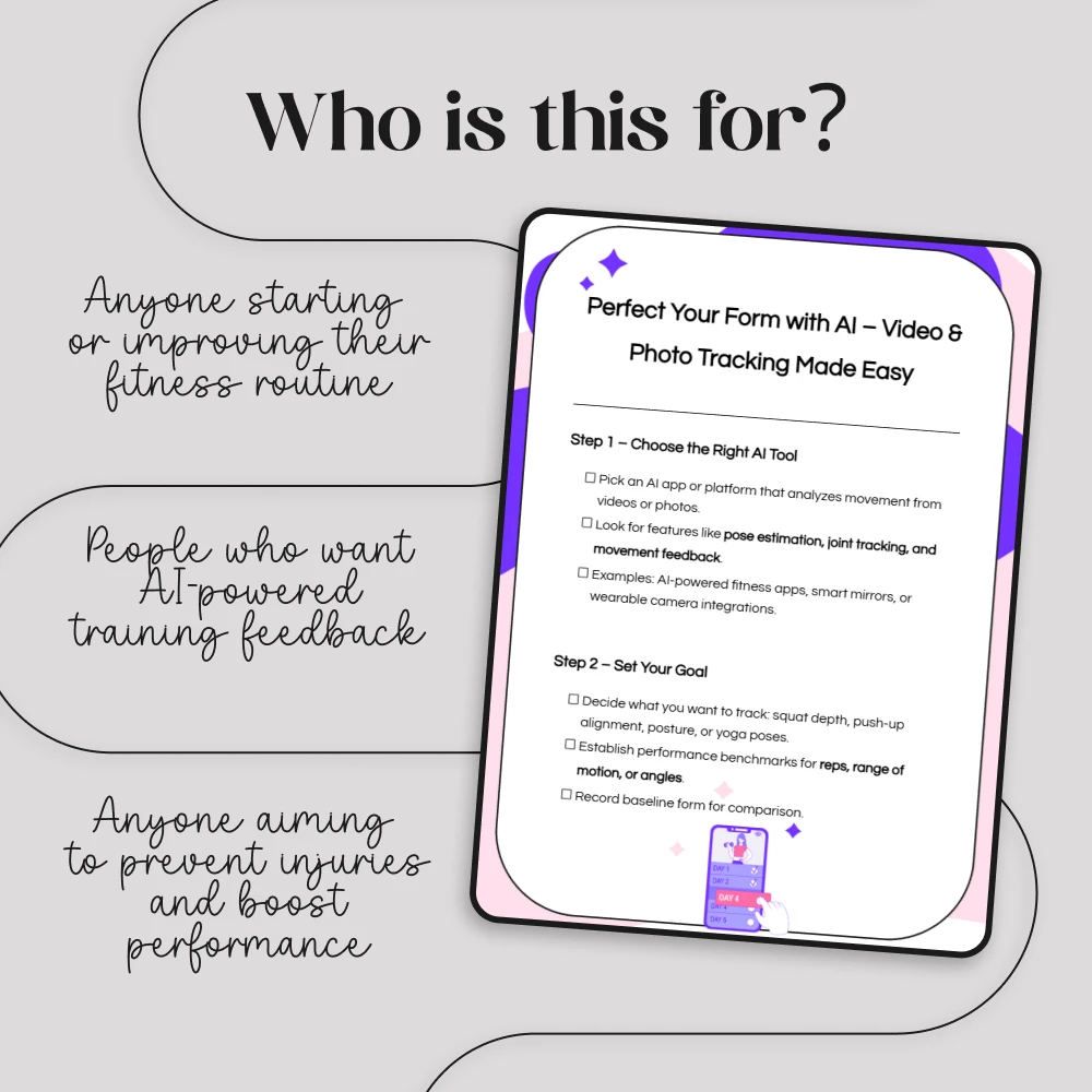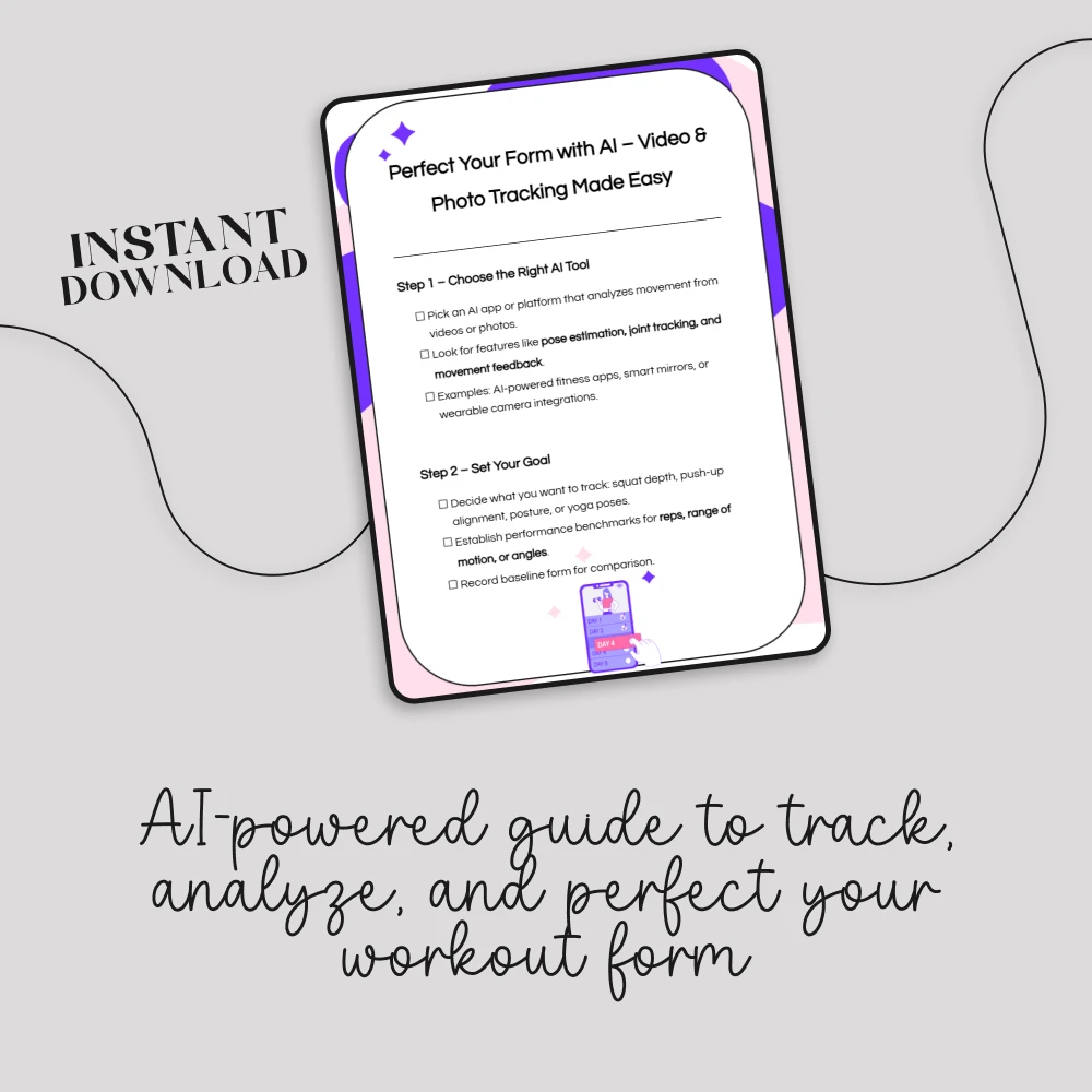Take the guesswork out of your workouts with Perfect Your Form with AI – Video & Photo Tracking Made Easy. This digital checklist shows you exactly how to use AI for tracking form via video and photos, giving you clear, step-by-step instructions to improve your technique, prevent injuries, and see measurable progress. Whether you’re working on squat depth, push-up alignment, posture, or yoga poses, this guide helps you use AI-powered tools to get accurate, data-driven feedback on your movements.